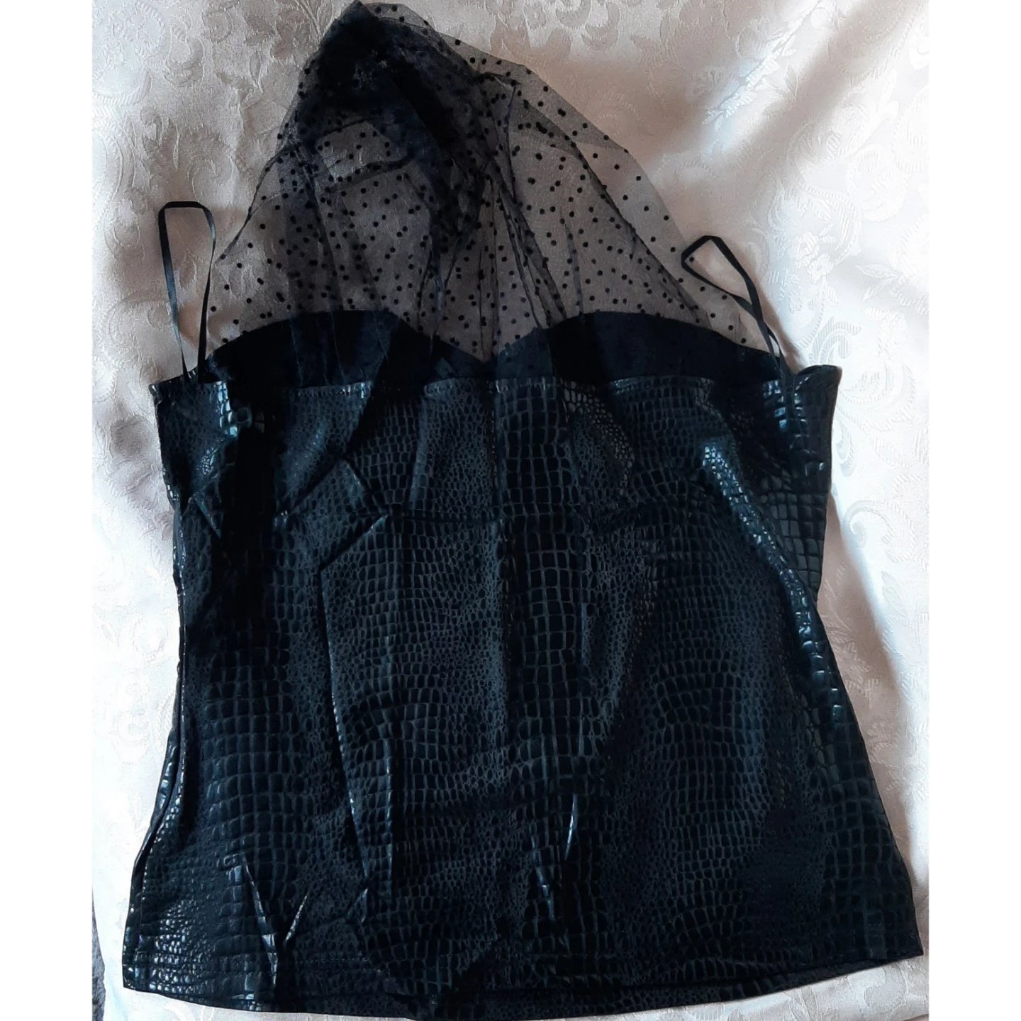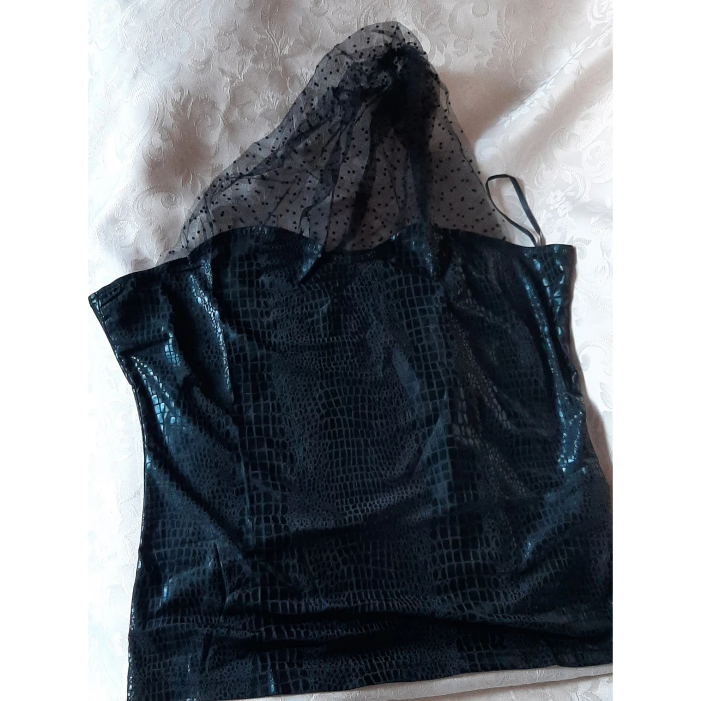 This striking black top features a one-shoulder design with sheer mesh overlay adorned with polka dots. It has a fitted bodice with a faux crocodile texture for a bold look. It's made of polyester and spandex for a comfortable fit.