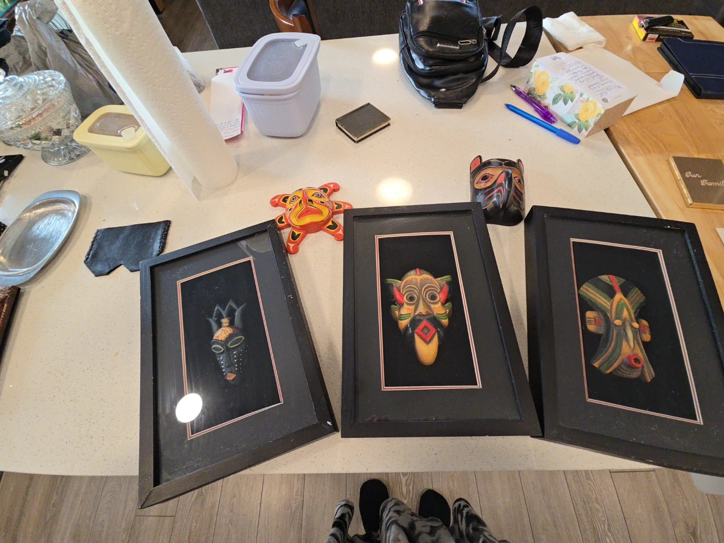 Three unique framed tribal masks for wall decor. Each mask displays vibrant colours and intricate designs. They're perfect for adding a touch of global charm to any room. Dimensions are approximately 12" x 18" for each frame.