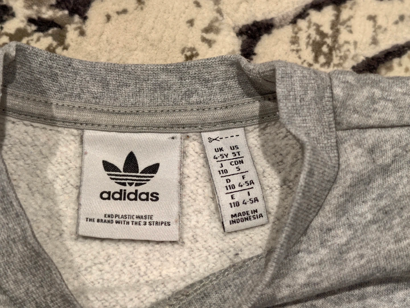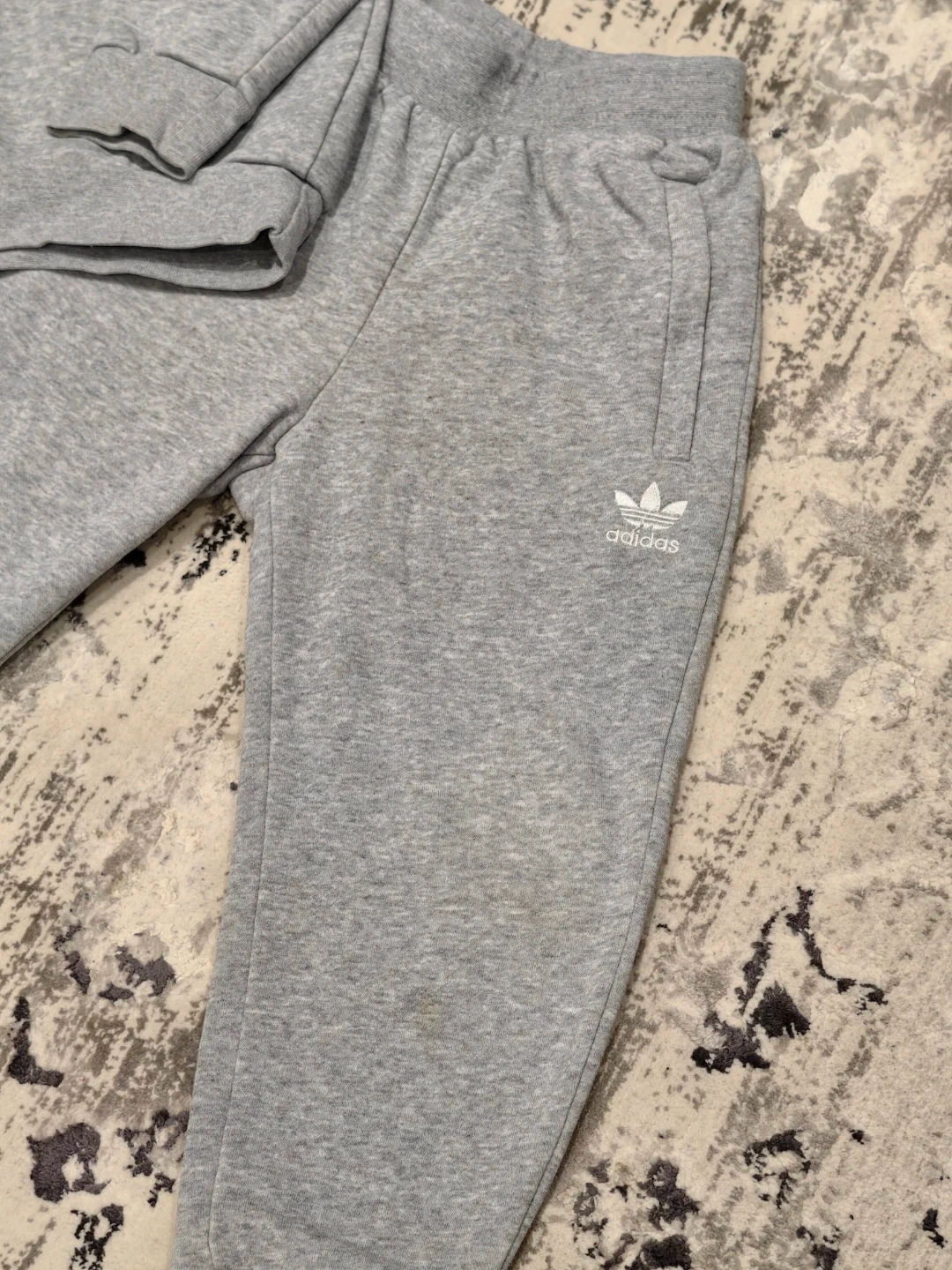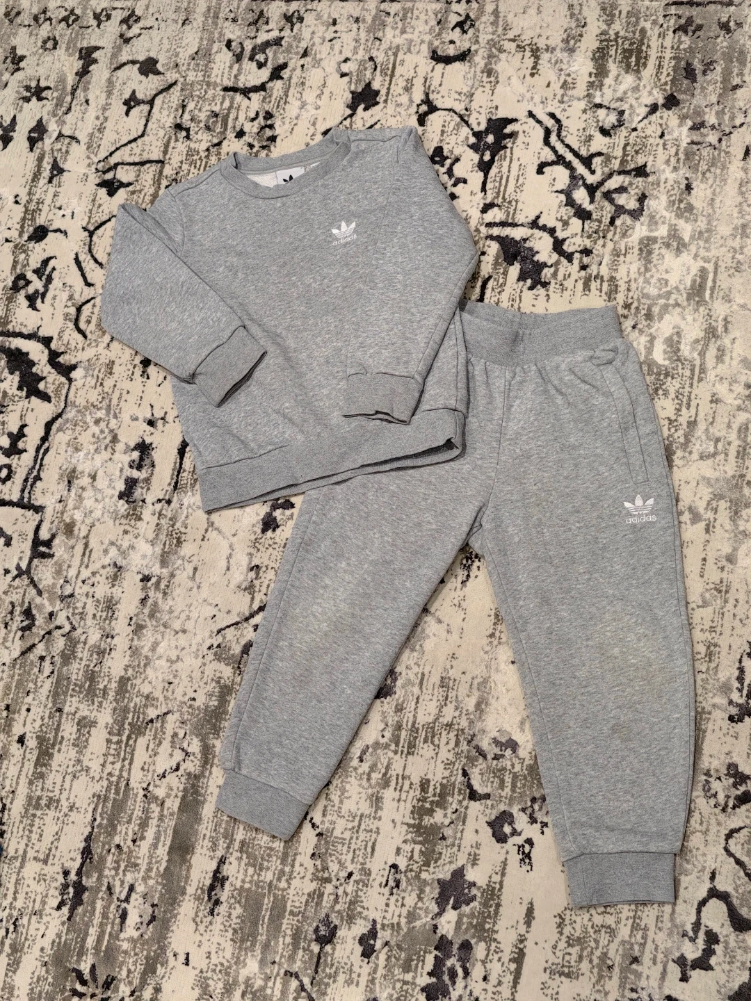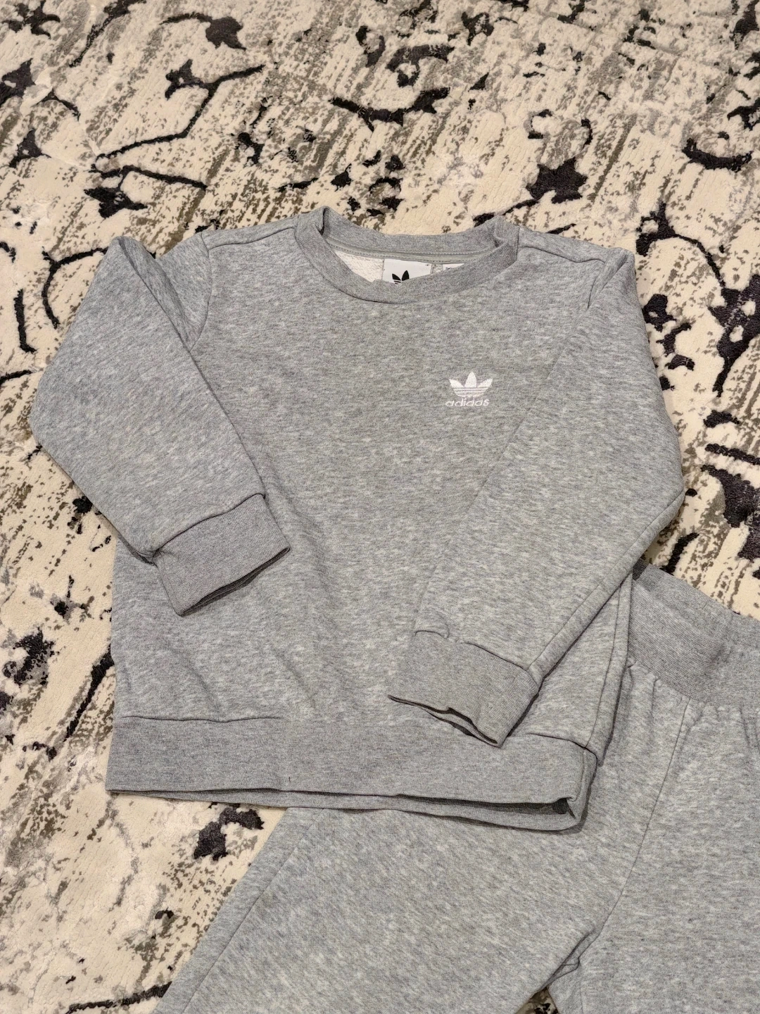 This is a grey Adidas sweat suit set for kids. It includes a crew neck sweatshirt and matching pants. Both pieces are made from a comfortable cotton blend fabric. Perfect for casual wear or active play!
