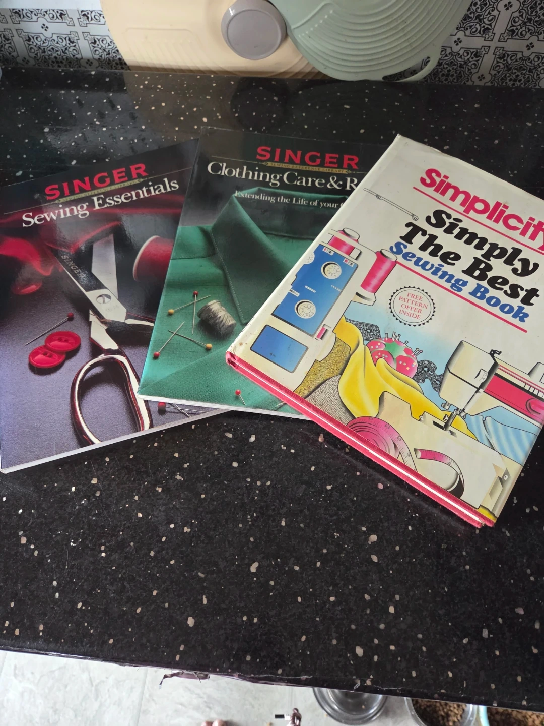 Bundle of three sewing books including "Singer Sewing Essentials", "Singer Clothing Care & Repair", and "Simplicity Simply The Best Sewing Book". These reference books offer guidance on various sewing techniques and garment care. Great for anyone looking to learn or improve their sewing skills!