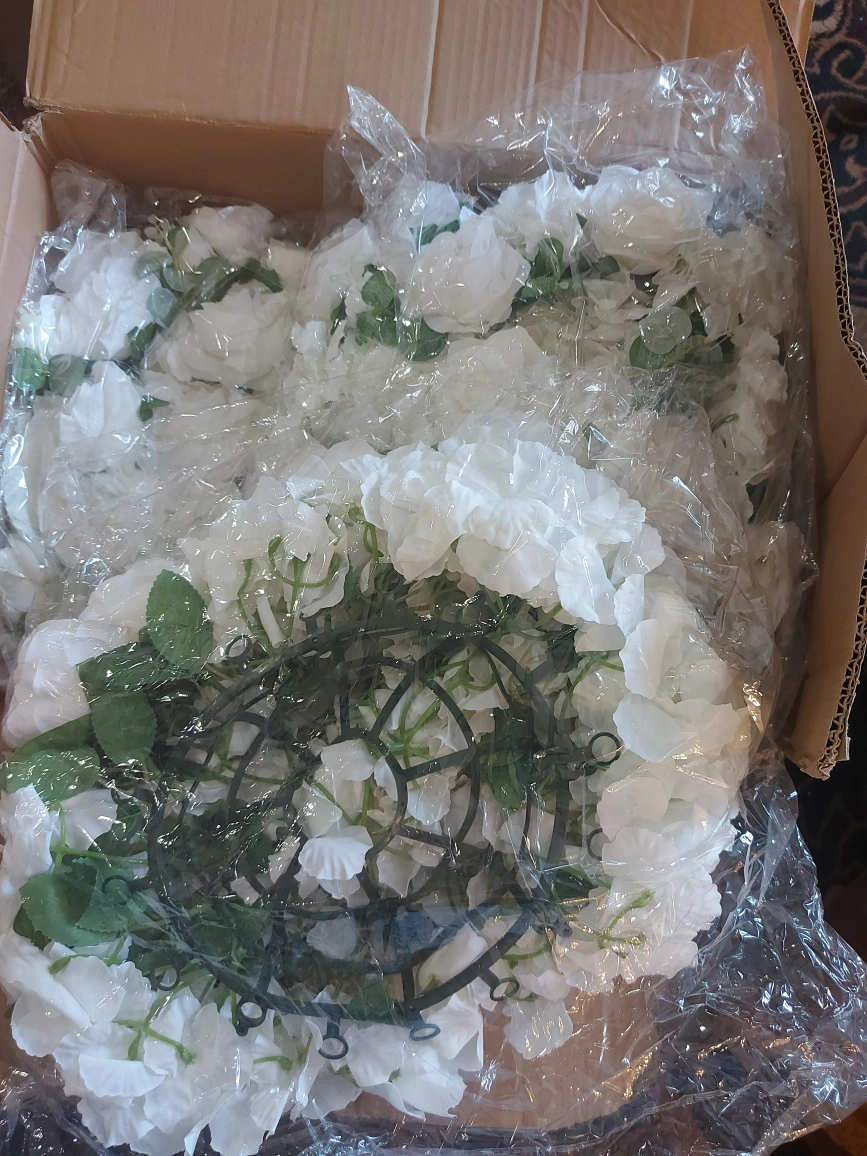 Beautiful artificial rose flower arrangement. Perfect for weddings or home decor. Includes multiple white roses and stem and leaf New in package.