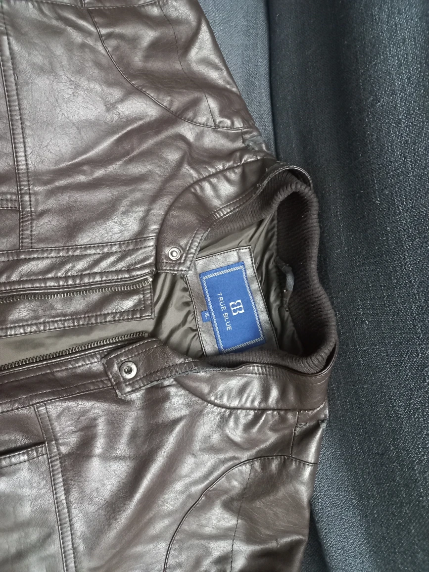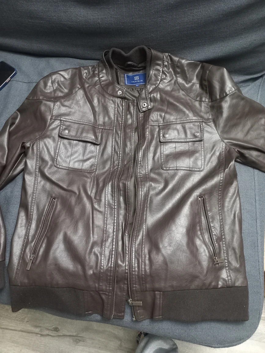 Free a True Blue brown leather jacket in size XL. It's in great condition and ready for a new home! tshirt size - 40