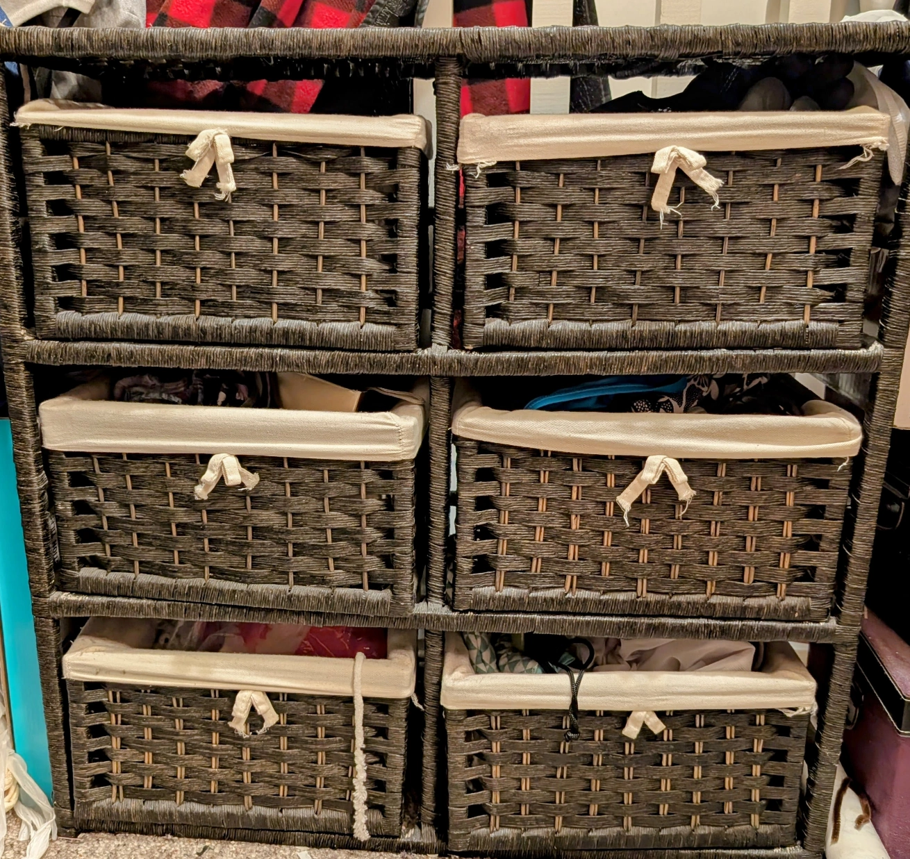 Dark brown wicker storage unit. Six pull-out drawers with beige fabric liners. Ideal for organizing closets or other storage spaces.