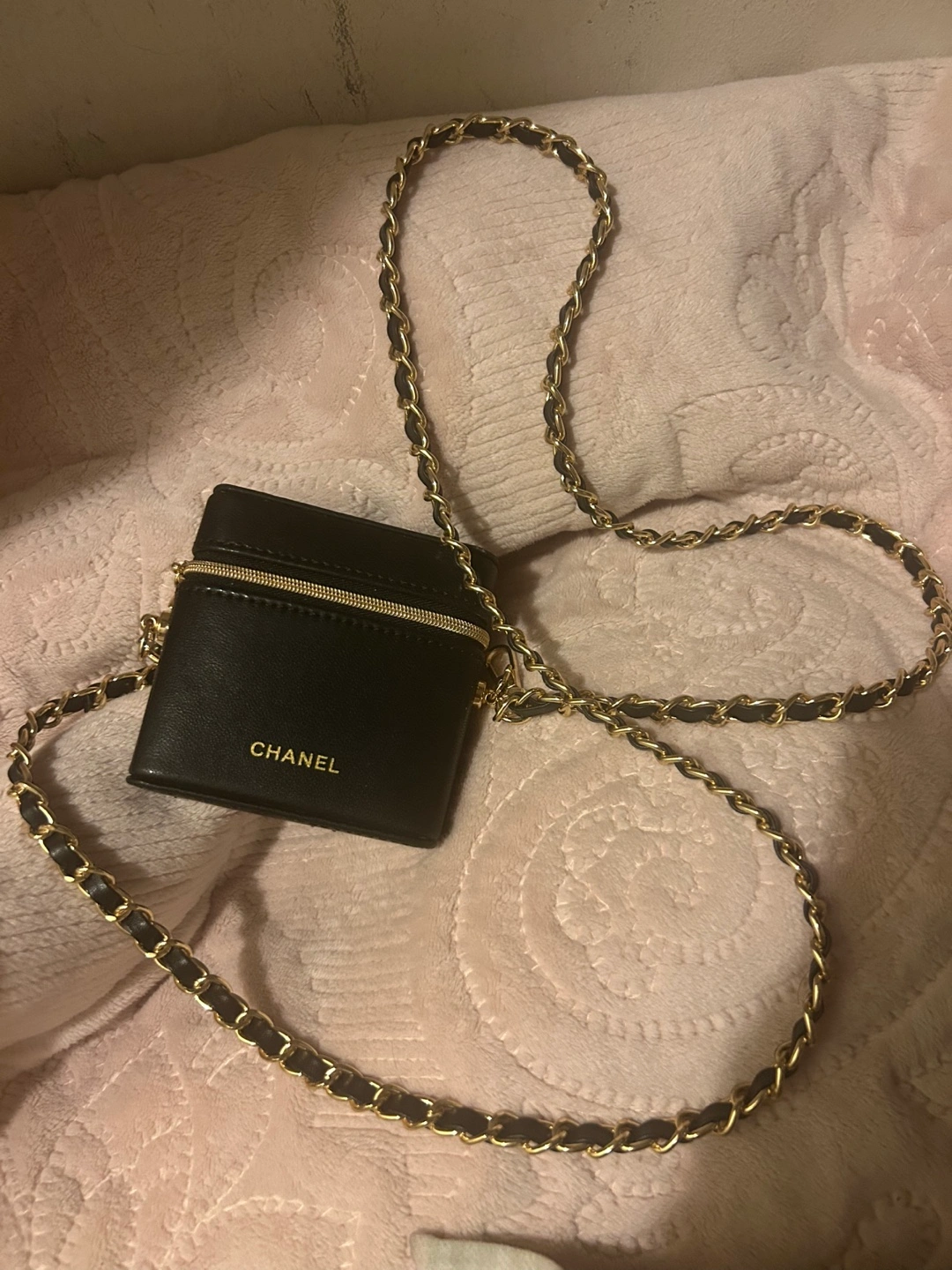 Black rectangular crossbody bag. The bag has a gold chain and gold hardware. Inside is a red interior. The bag has a zipper closure. You could use this bag to store your most precious belongings. from Chanel beauty - lipstick bag