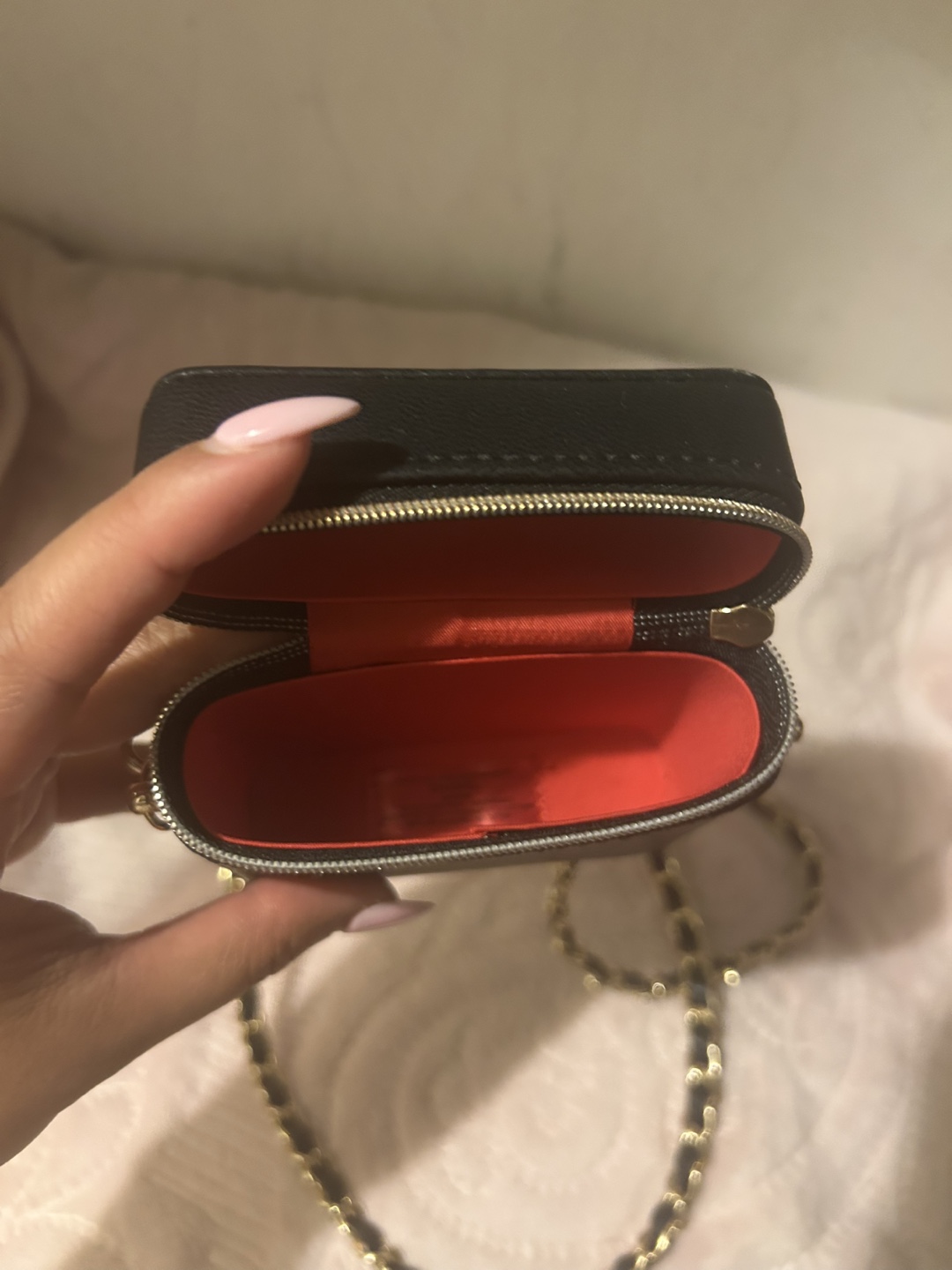 Black rectangular crossbody bag. The bag has a gold chain and gold hardware. Inside is a red interior. The bag has a zipper closure. You could use this bag to store your most precious belongings.