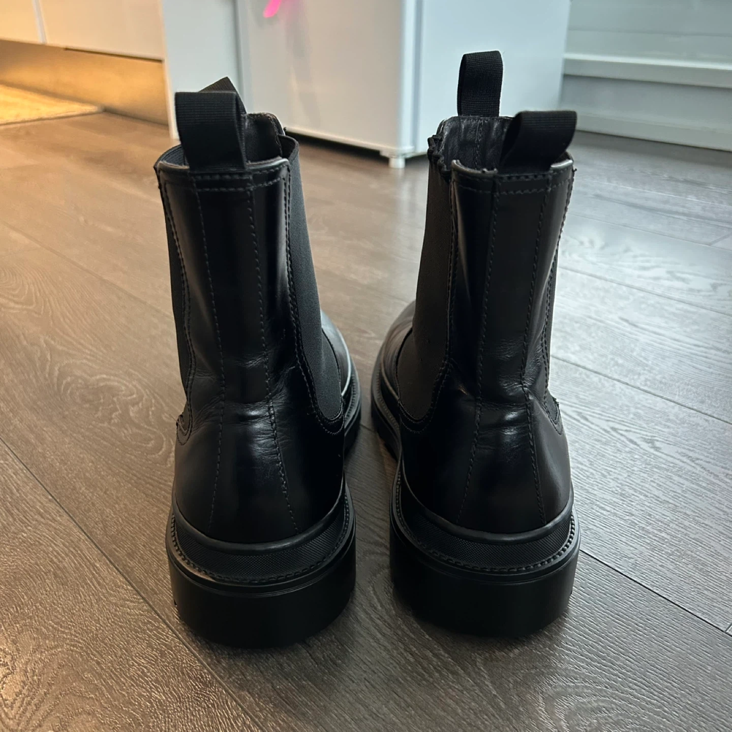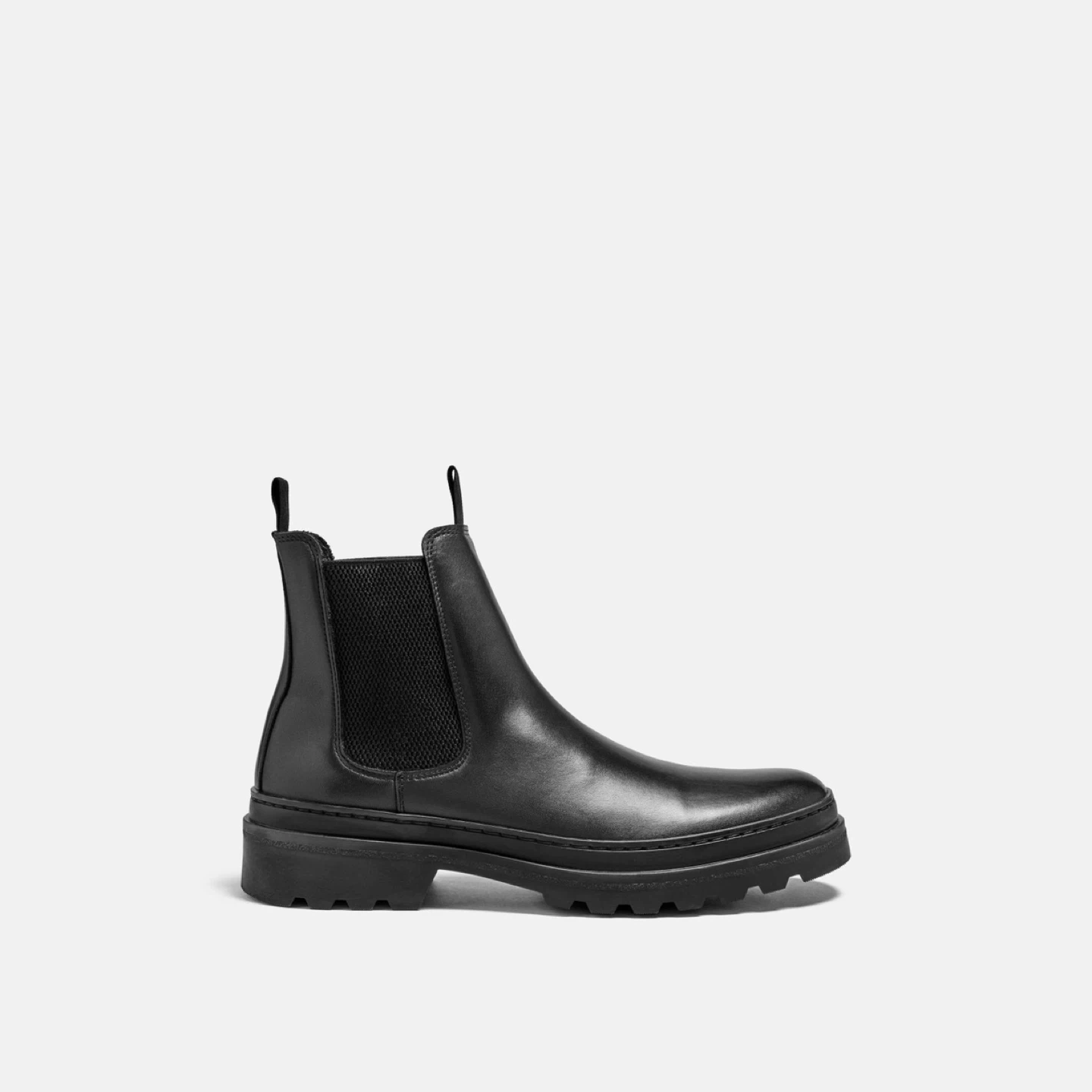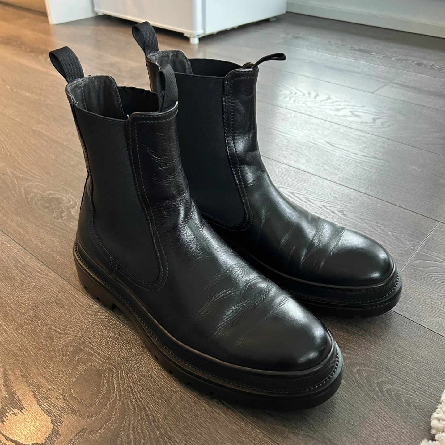 Classic black leather Chelsea boots from the brand MINELLI Paris. Features elastic side panels and a chunky lug sole. These boots are made of leather with a rubber sole.