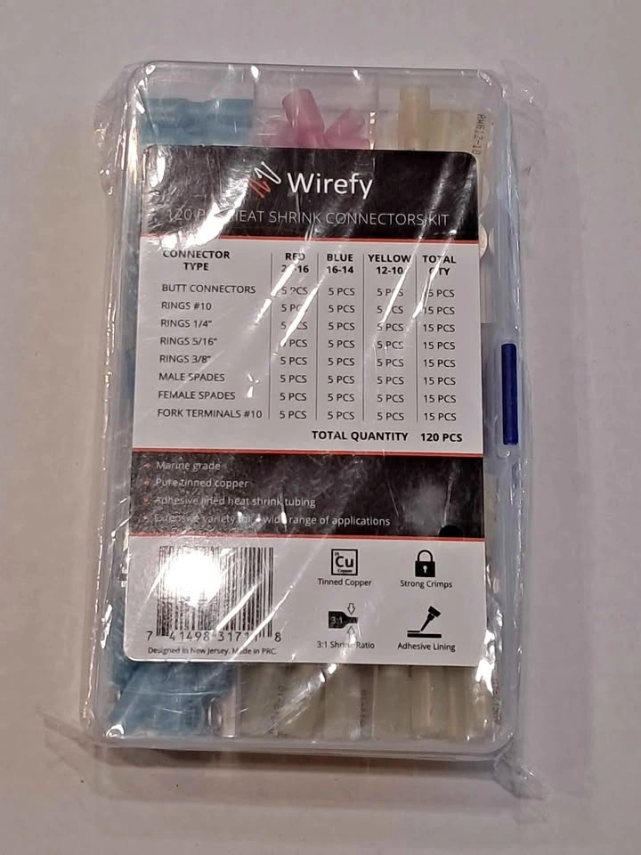 120 pcs heat shrink connectors kit. Marine grade pure tinned copper. Adhesive lined heat shrink tubing. Extensive variety for a wide range of applications. Brand new sealed.