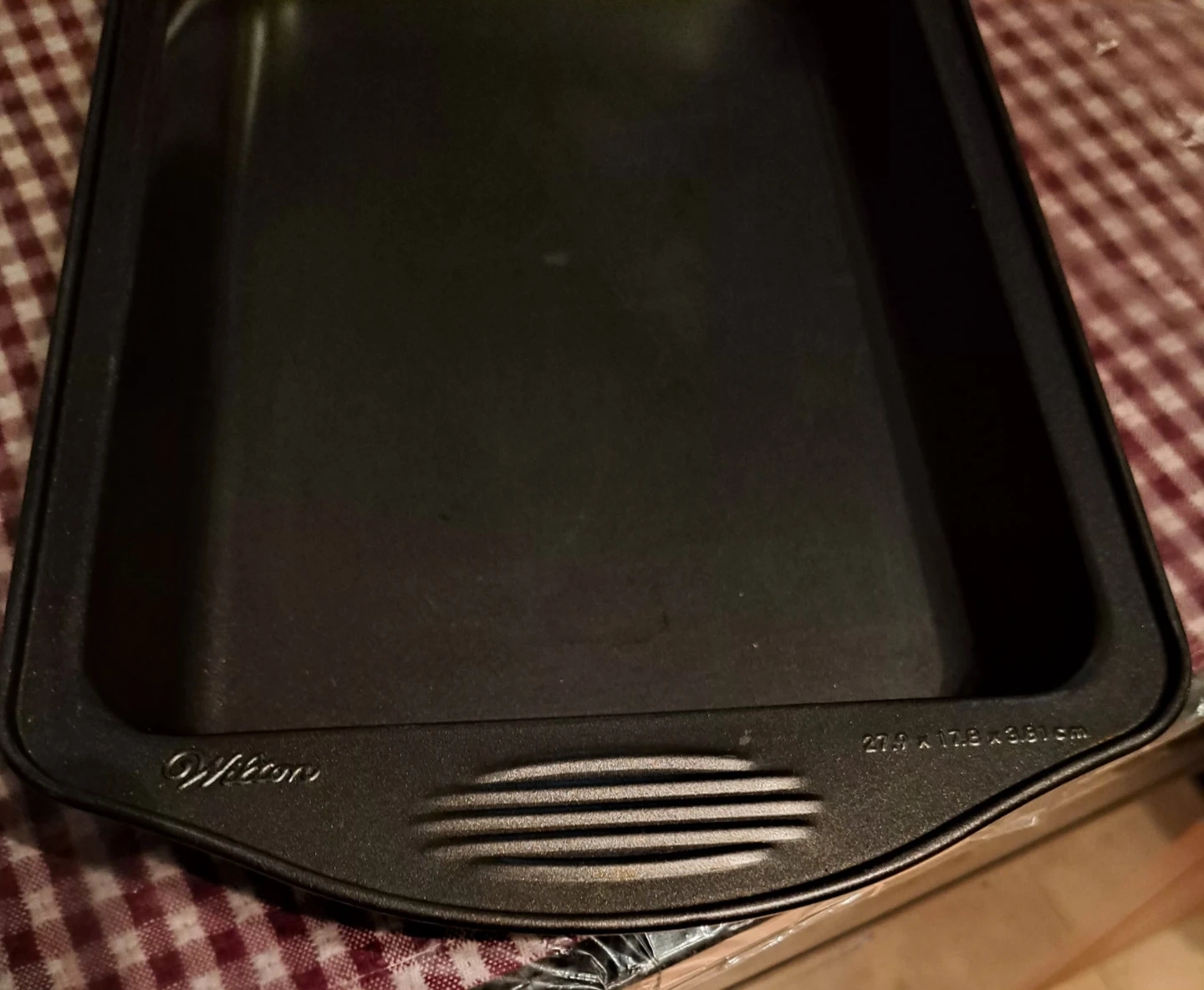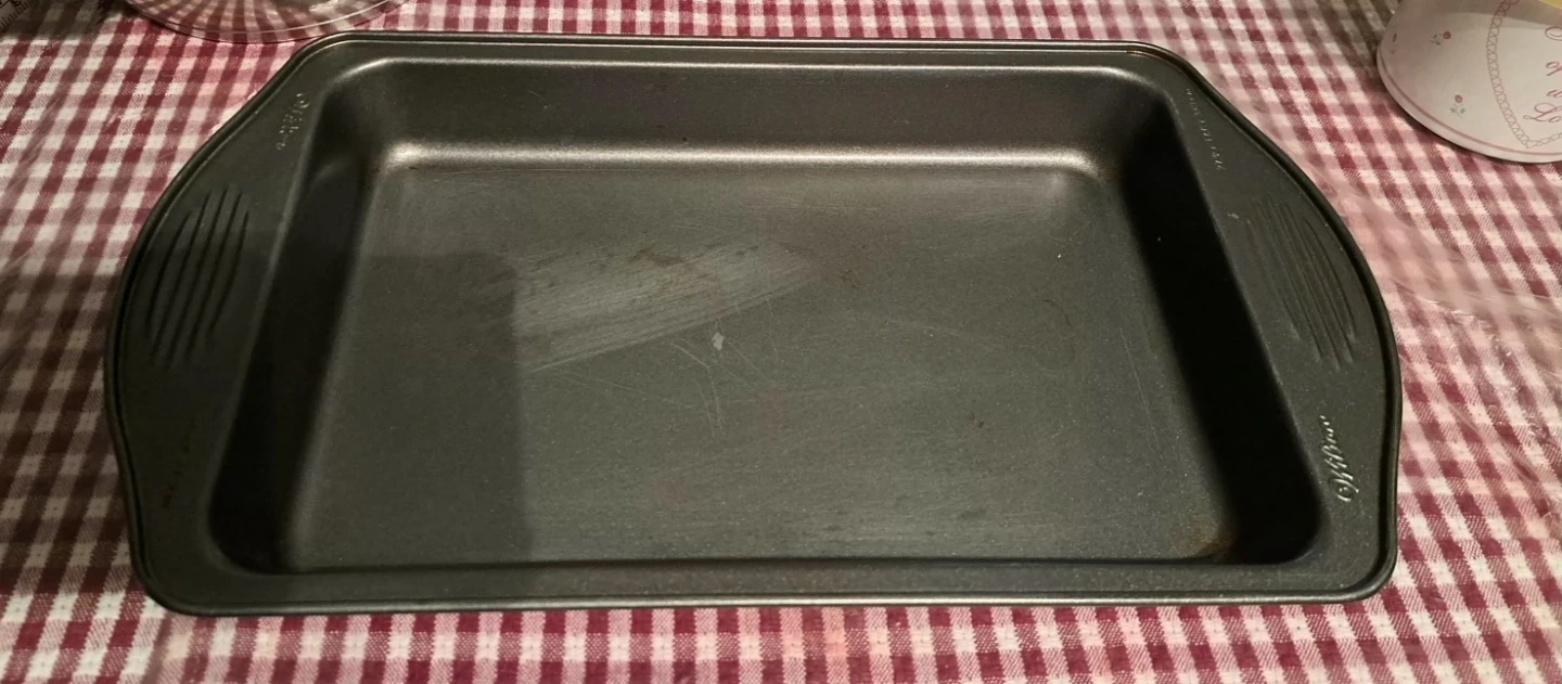 A Wilton baking pan, perfect for roasting or baking. It measures 27.9 cm by 17.8 cm by 3.81 cm. This pan is great for weeknight dinners or weekend treats!