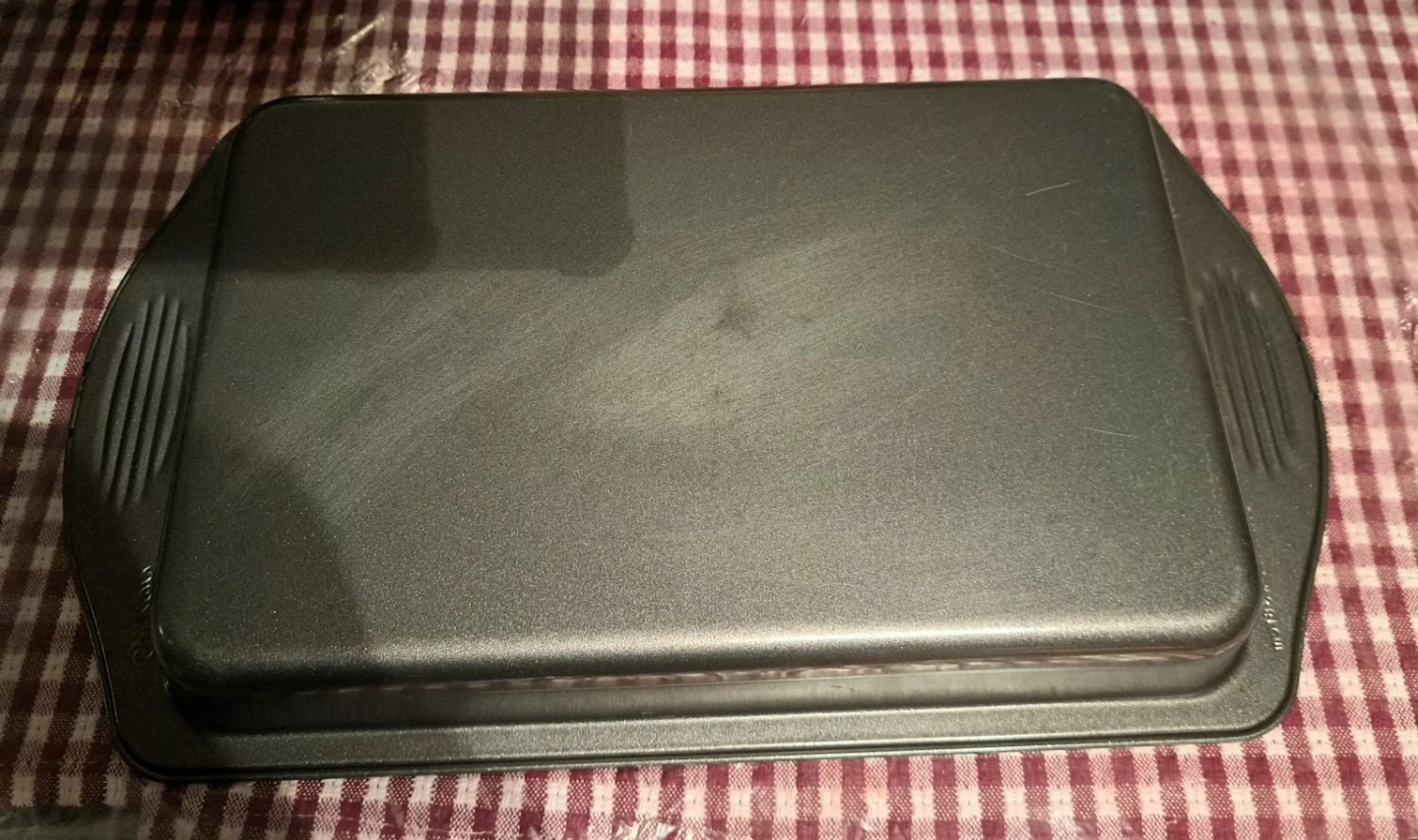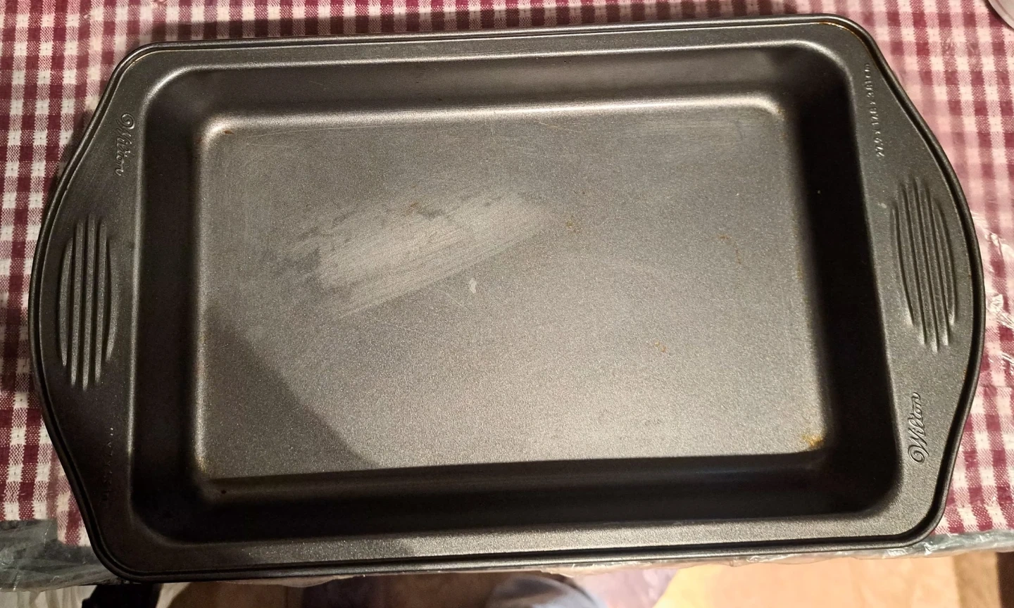 A Wilton baking pan, perfect for roasting or baking. It measures 27.9 cm by 17.8 cm by 3.81 cm. This pan is great for weeknight dinners or weekend treats!