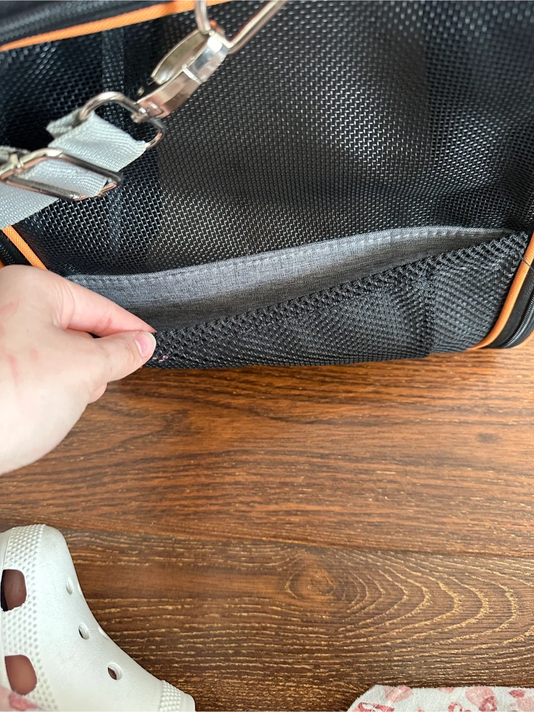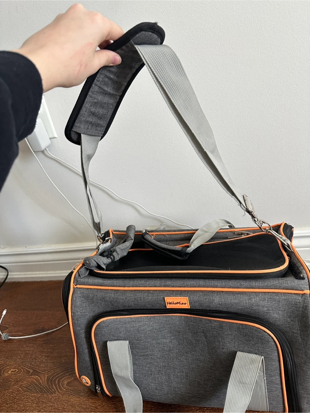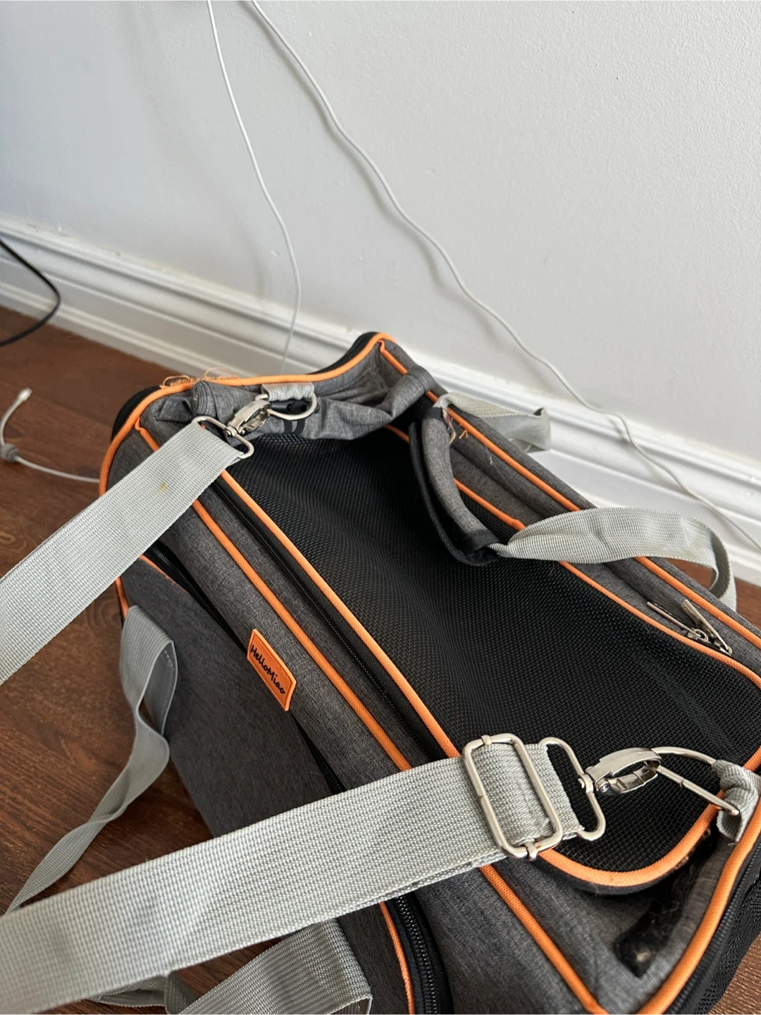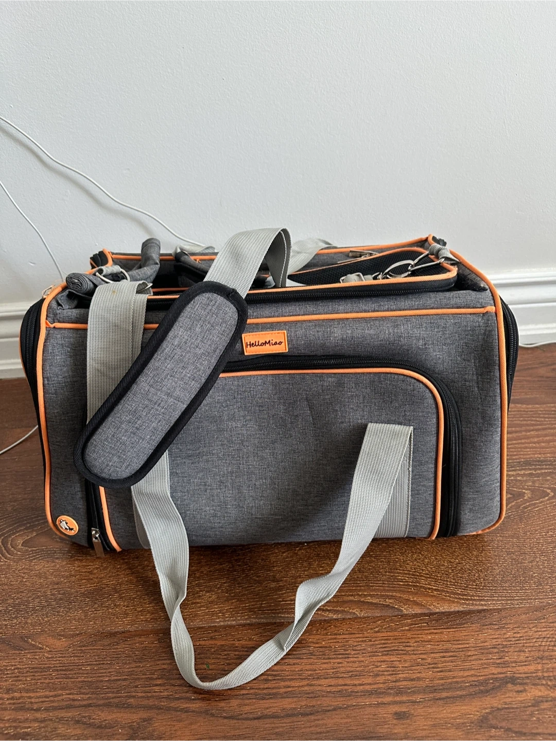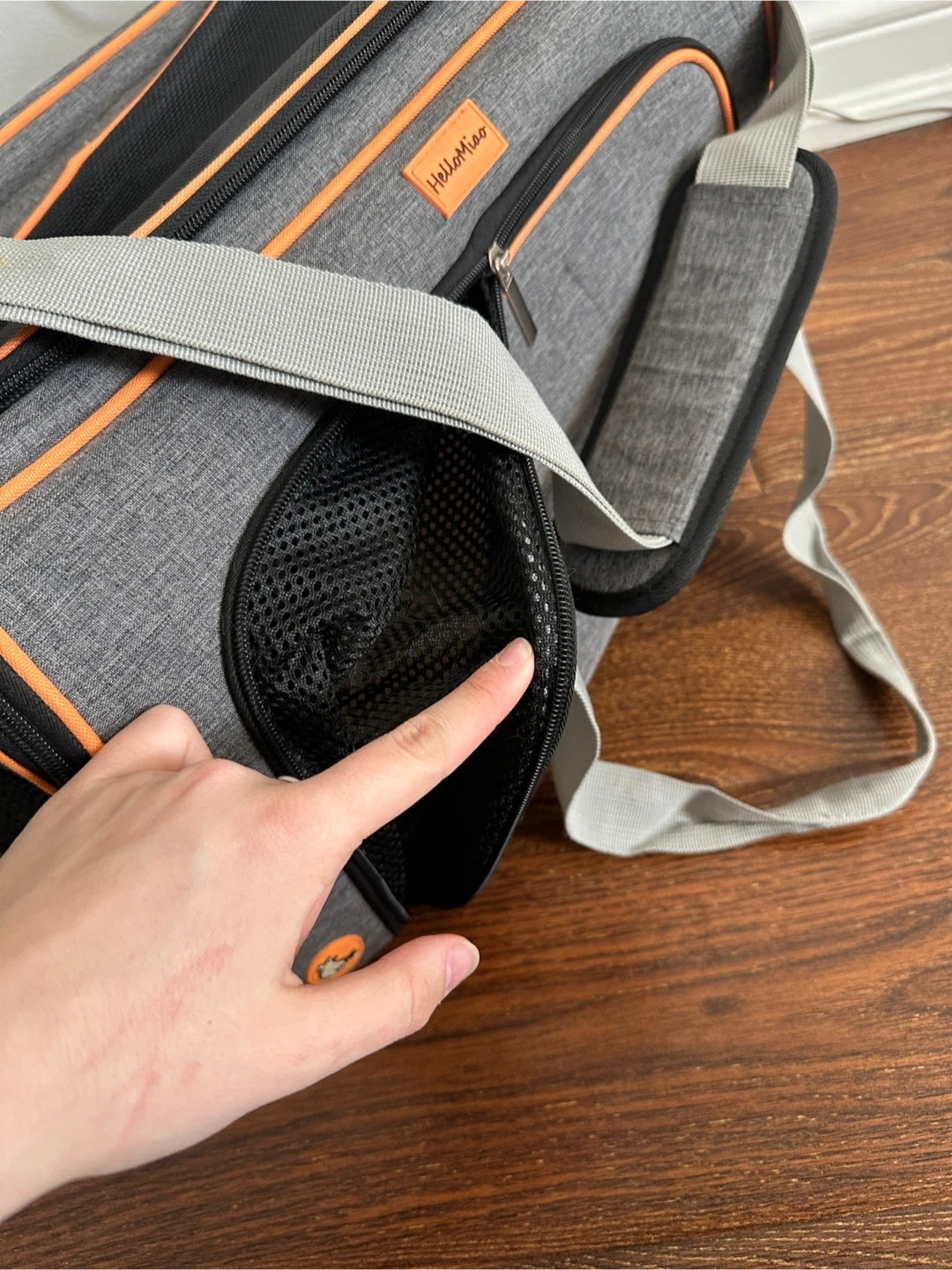 Grey and orange pet carrier bag with mesh windows. Features top handles and a detachable shoulder strap. It's a great way to transport your small pet safely!