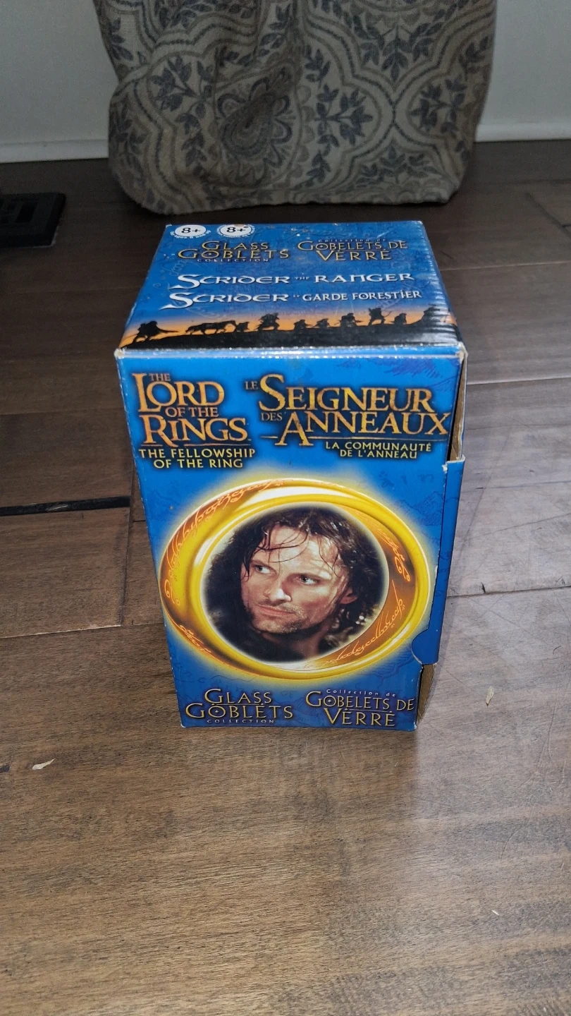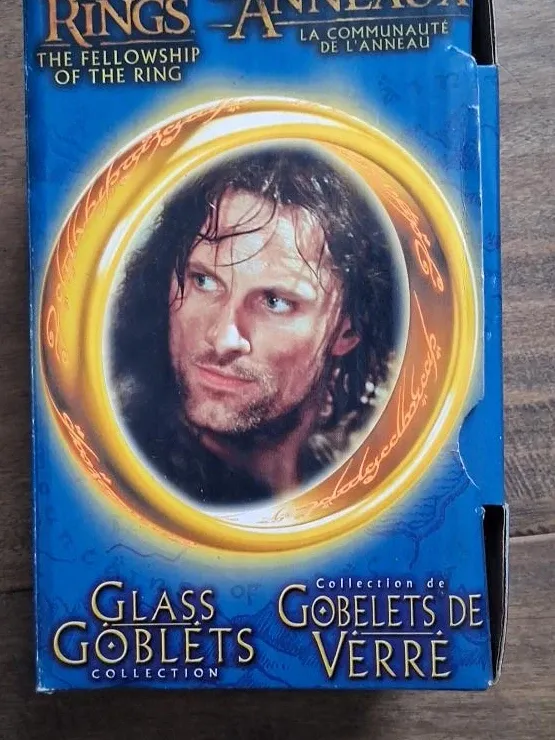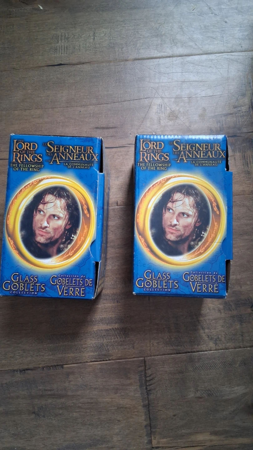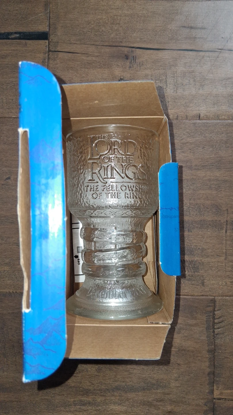 This is a glass goblet from The Lord of the Rings: The Fellowship of the Ring collection. It's made of clear glass with embossed text. The original box is included. Selling the 2 as different ones.