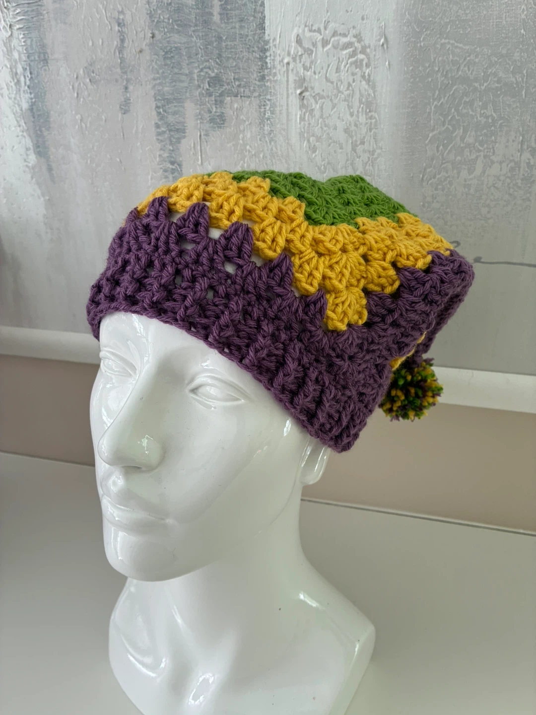 This is a handmade crochet jester hat in Mardi Gras colours. It features two matching pom poms on the sides. It's a cozy and stylish accessory!