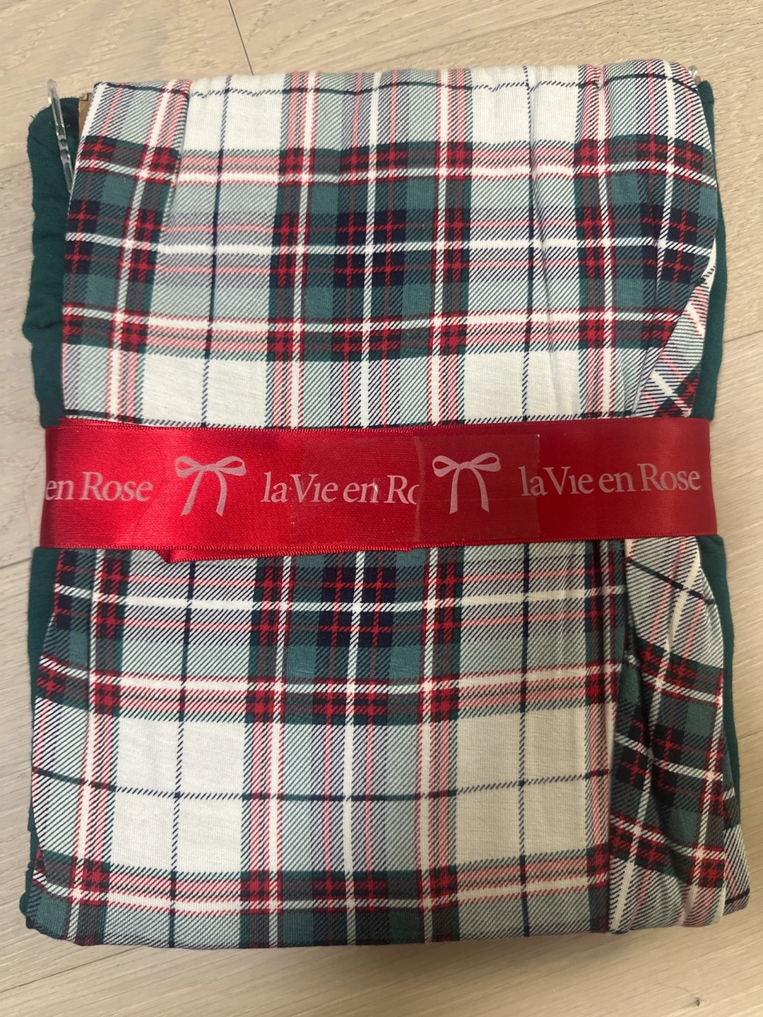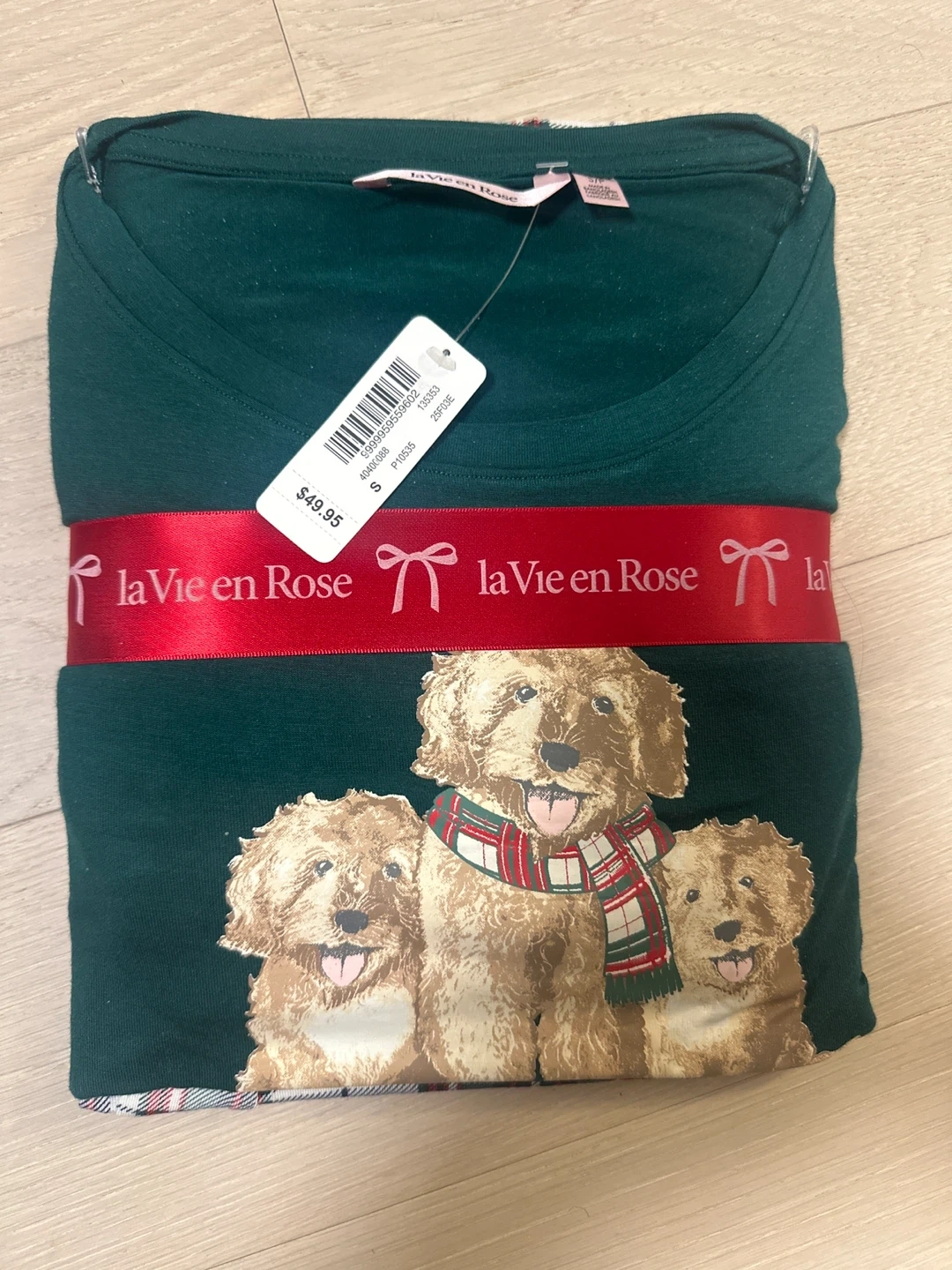 Cozy La Vie en Rose pajama set featuring a cute green top with a golden retriever print. The matching plaid bottoms complete this festive set. Made for ultimate comfort! Size small