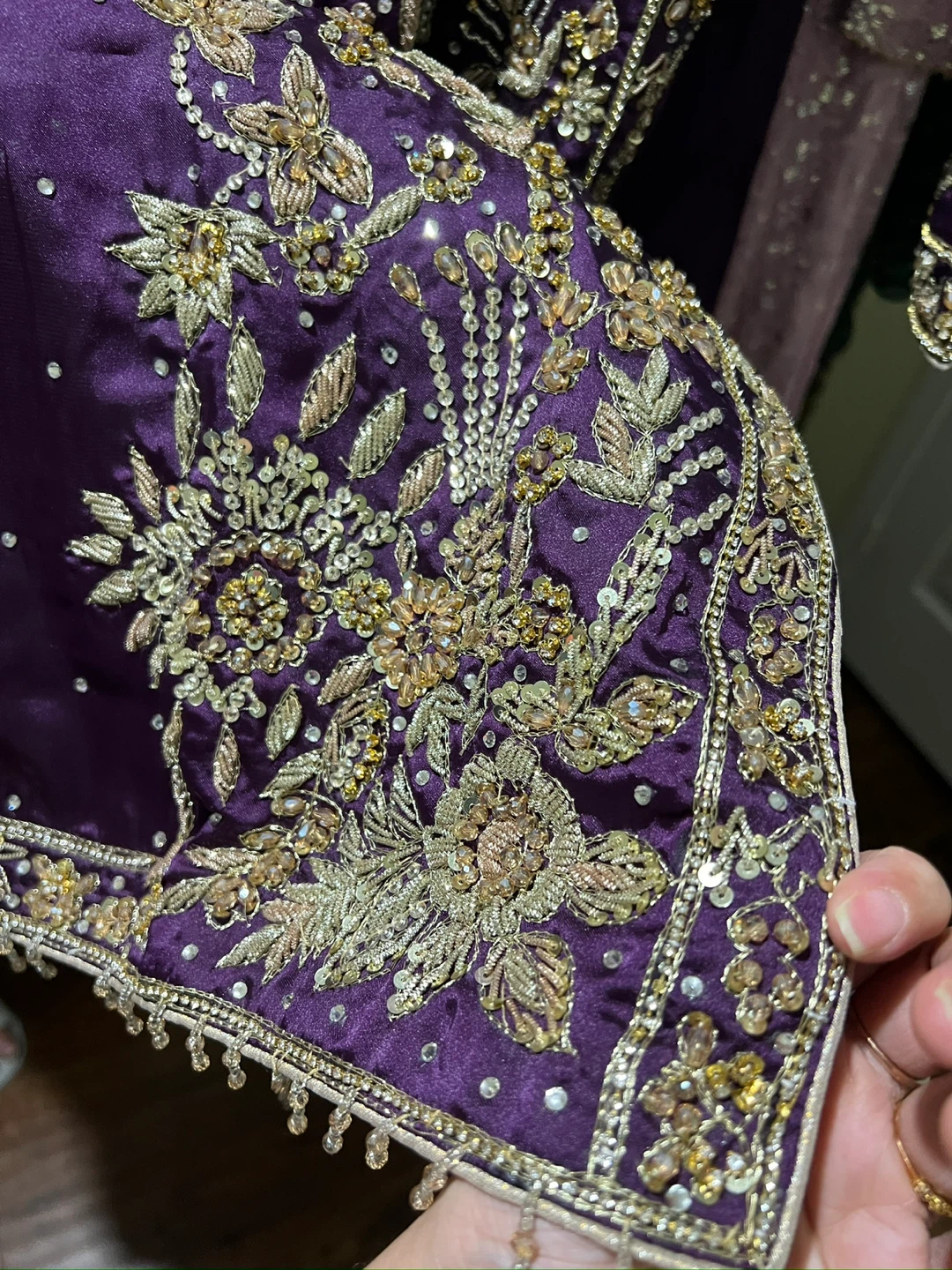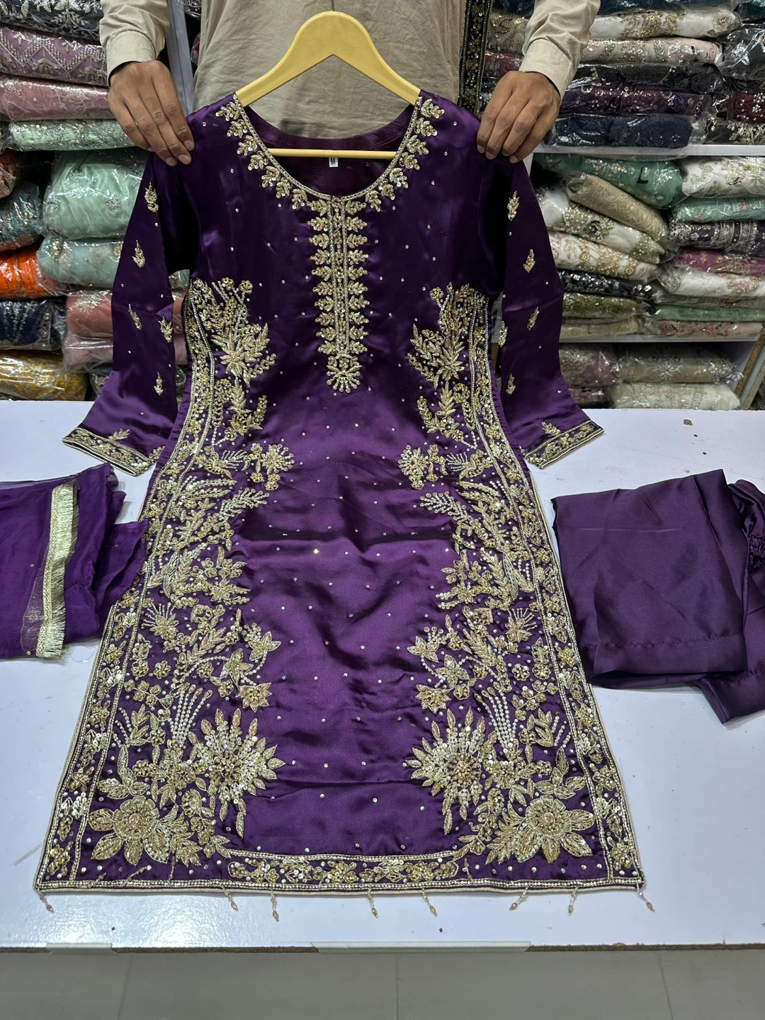Beautiful article in silk Fabric with Handmade Cora Dabka work , Heavy embroidered sleeves