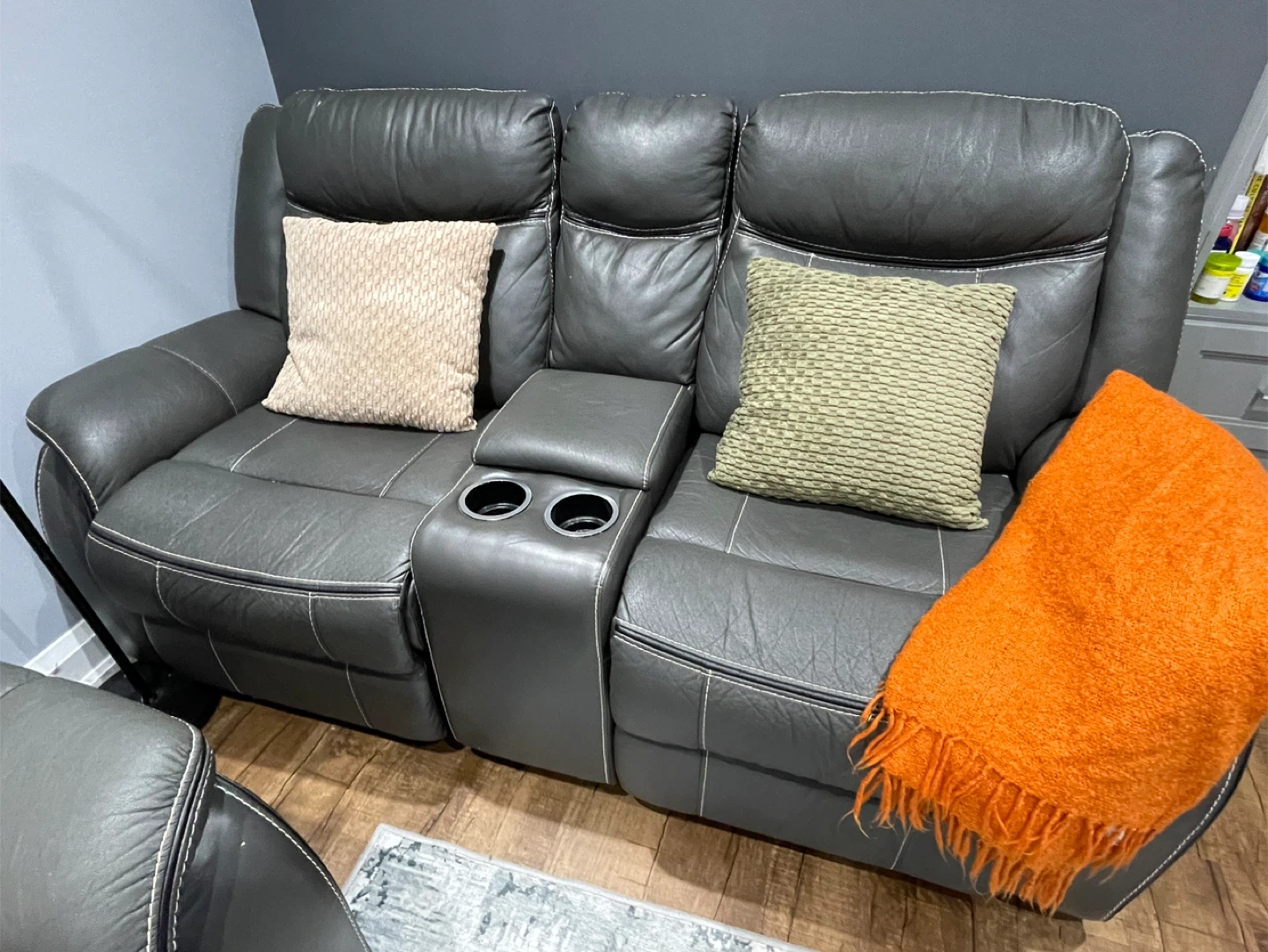 Selling our comfy grey leather reclining sofas! 2 sofas - one with three seats and a love seat with convenient centre console with cup holders. Perfect for movie nights or just relaxing after a long day