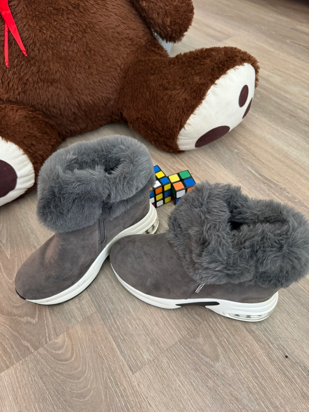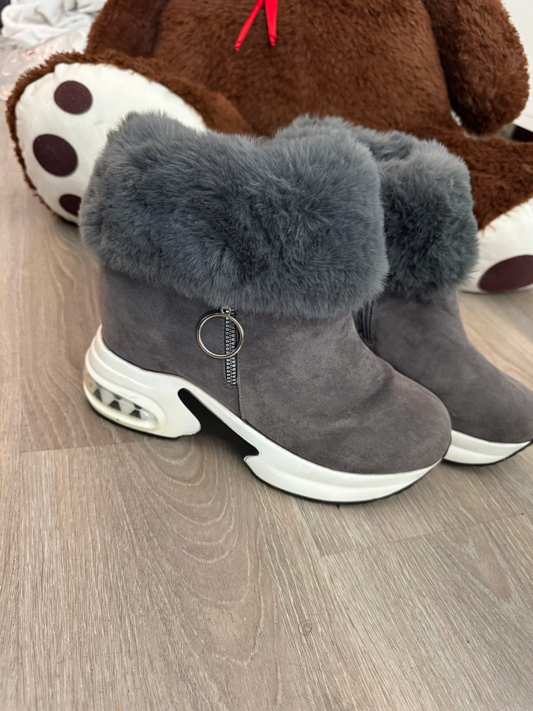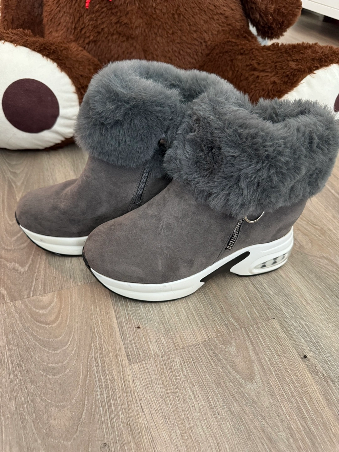 Grey ankle boots with plush faux fur lining for warmth. These boots feature a side zipper for easy on and off. The soles have a chunky white and black design with air cushioning for comfort. They're a stylish choice for colder weather! Size is a small 43. Real size is 41