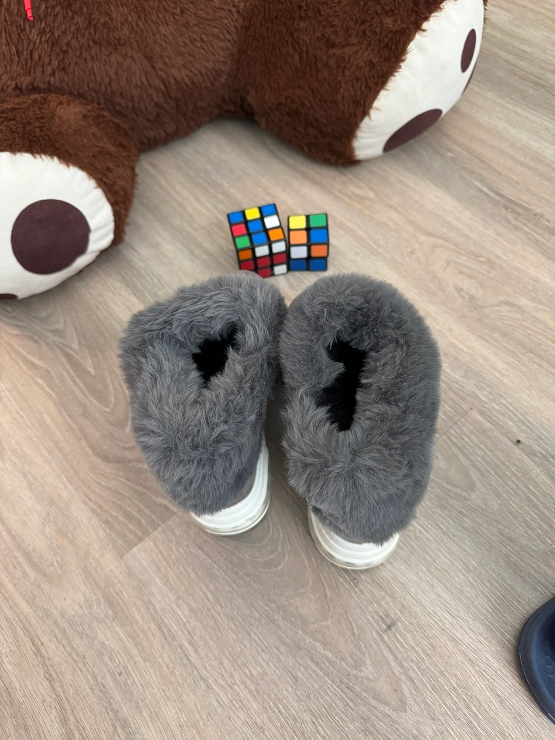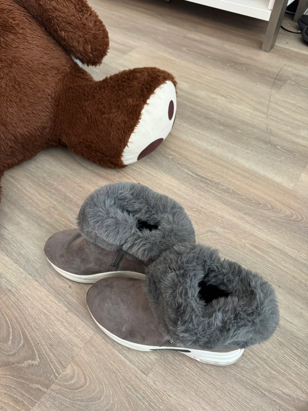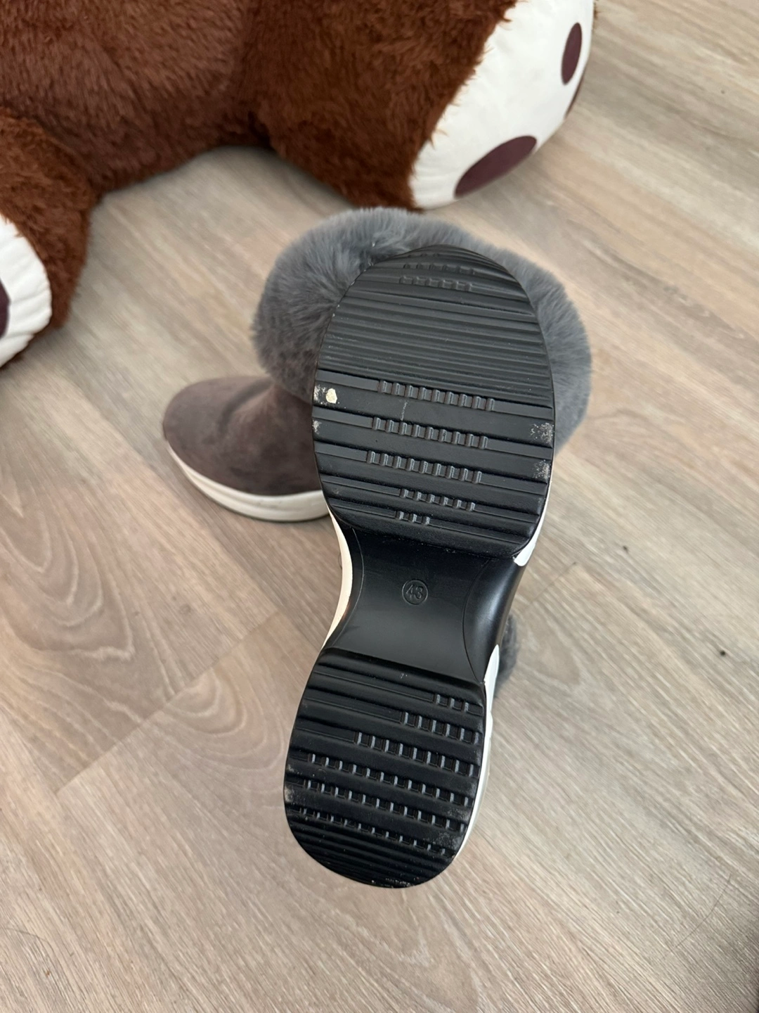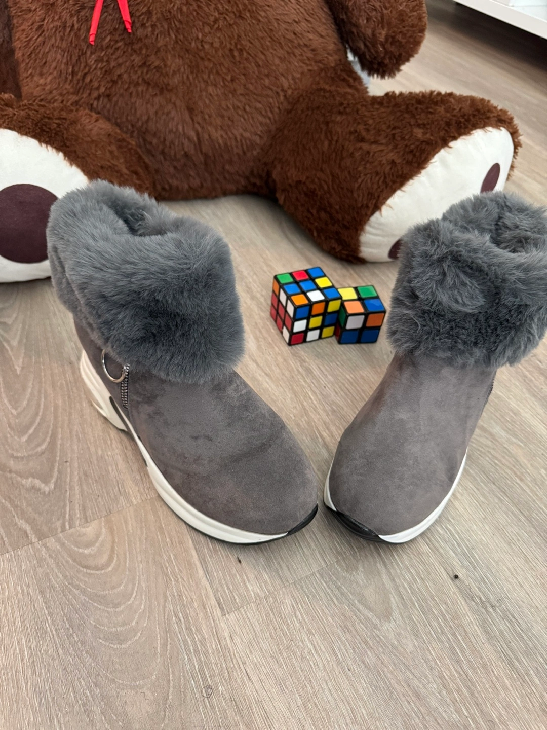 Grey ankle boots with plush faux fur lining for warmth. These boots feature a side zipper for easy on and off. The soles have a chunky white and black design with air cushioning for comfort. They're a stylish choice for colder weather! Size is a small 43. Real size is 41