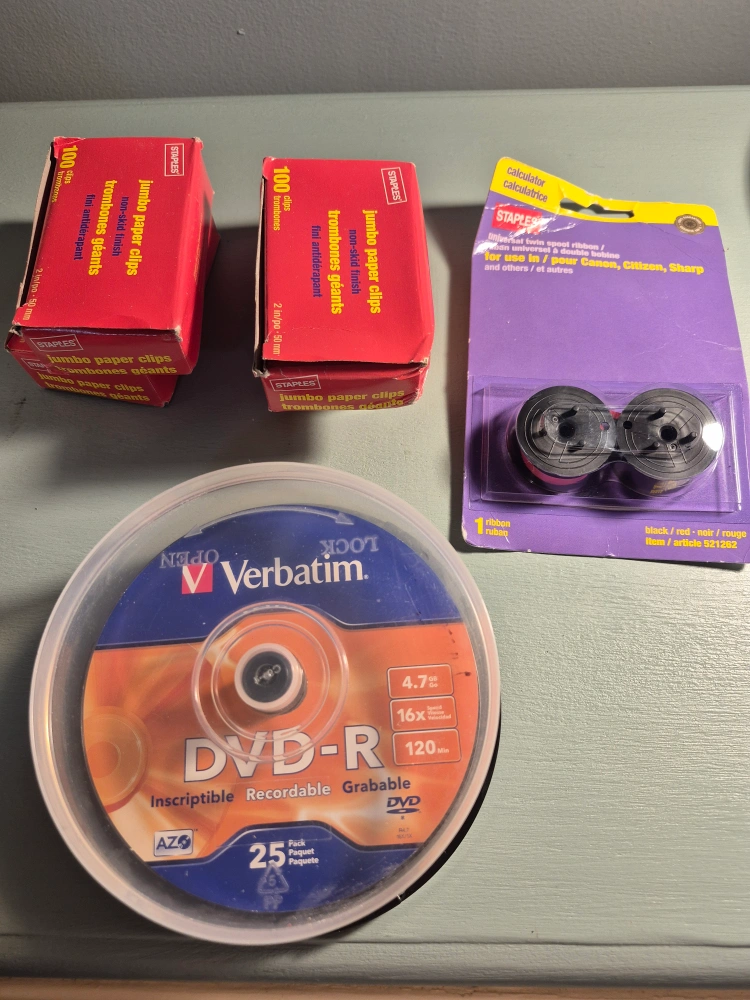 Bulk lot of office supplies. Includes three boxes of Staples jumbo paper clips, one pack of Verbatim DVD-R discs, and one roll of calculator tape. All new and unused. all for $5