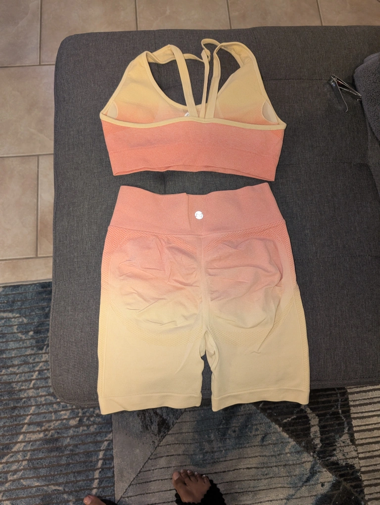 Selling an ombre activewear set! The set includes a sports bra and matching shorts. The colour gradient transitions from yellow to peach. Perfect for workouts or lounging around