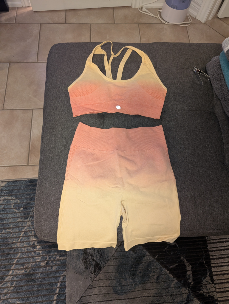 Selling an ombre activewear set! The set includes a sports bra and matching shorts. The colour gradient transitions from yellow to peach. Perfect for workouts or lounging around
