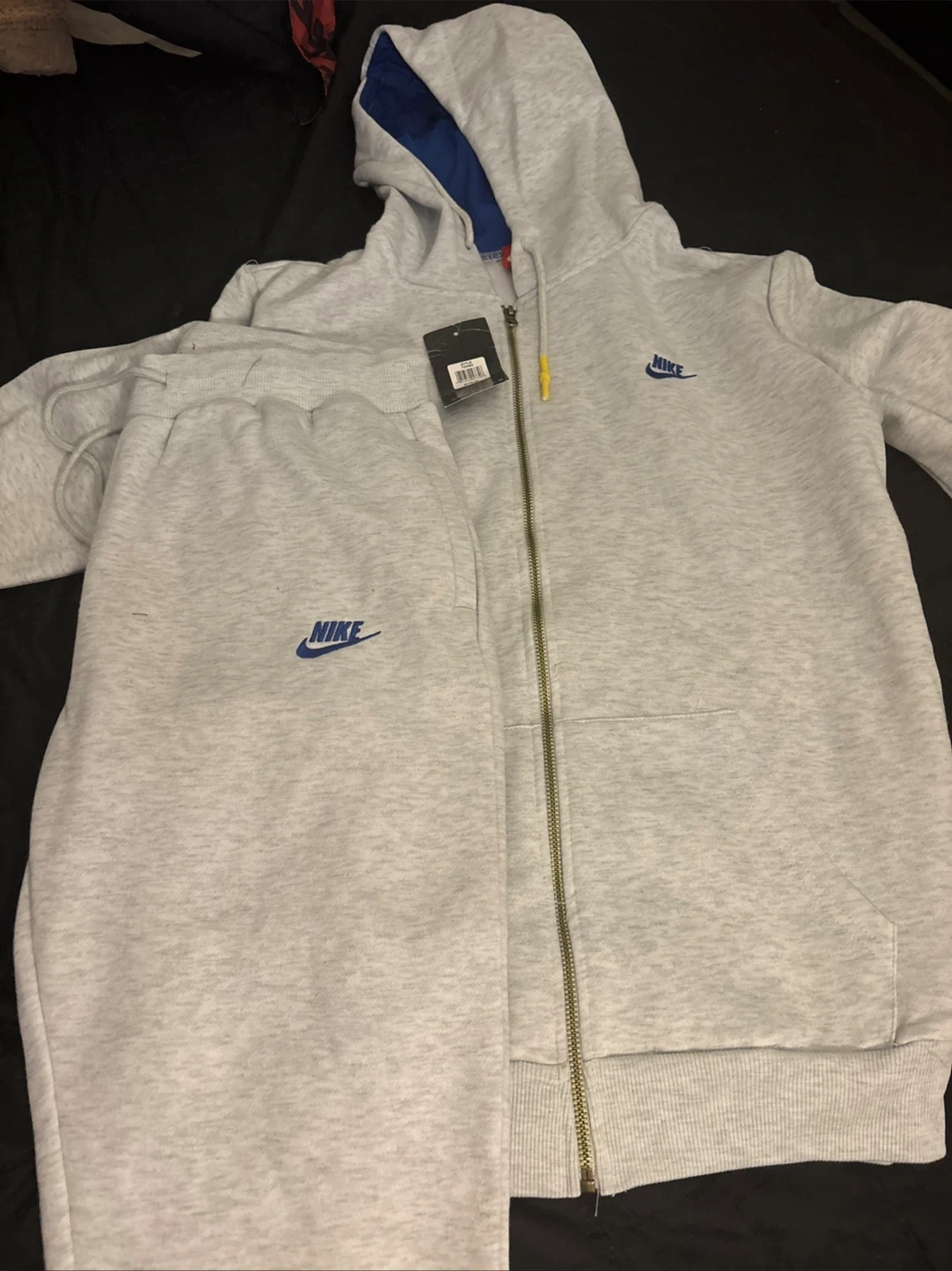 This is a Nike full zip hoodie and jogger set. It's a light grey color with blue Nike logos. The set includes a hooded zip-up jacket and matching sweatpants. Material is soft fleece, perfect for casual wear.