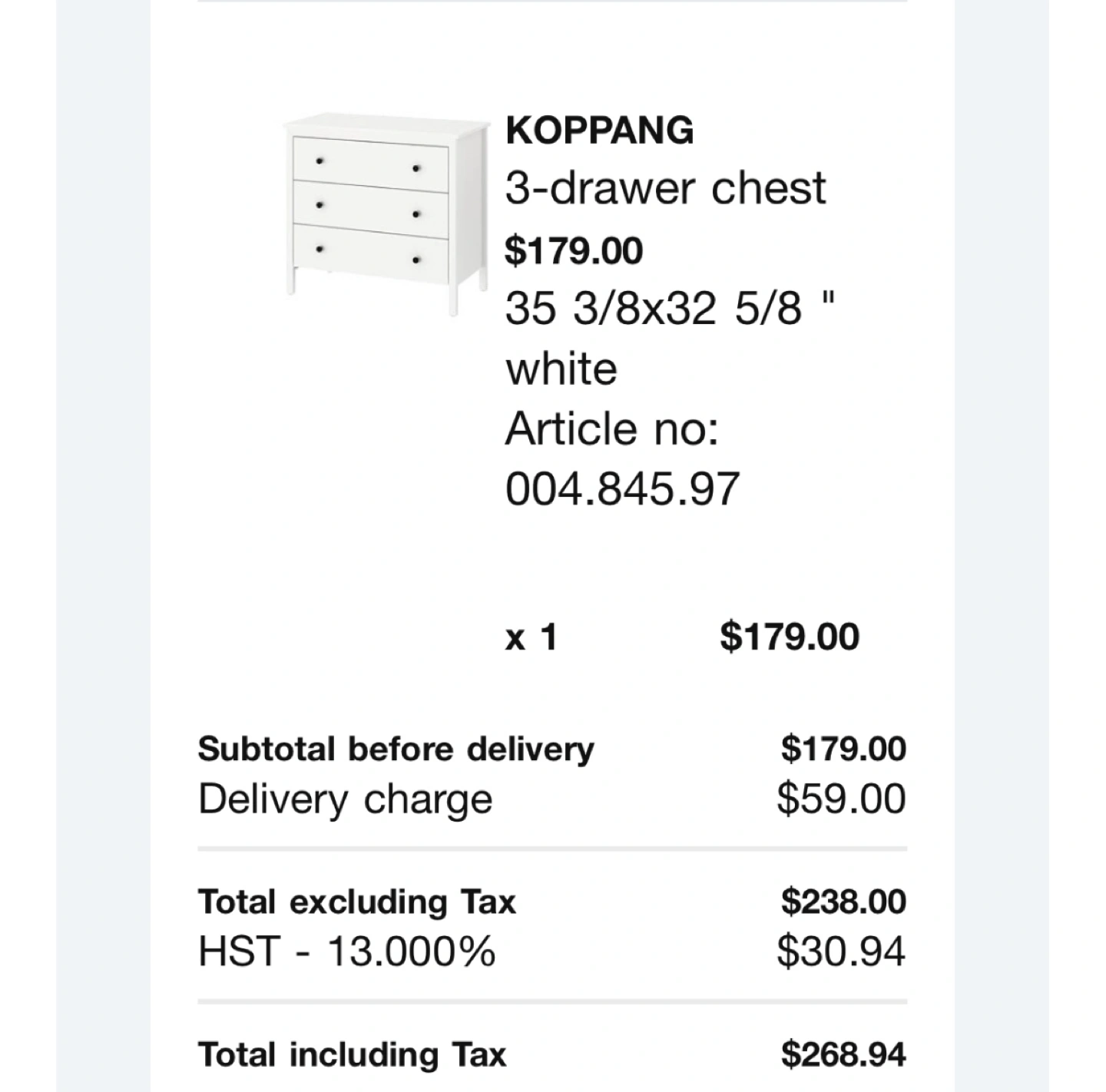 Selling my gently used KOPPANG 3-drawer chest in white. It’s in great condition, clean, and perfect for organizing your bedroom or any living space. Originally purchased for $179 + taxes, but I’m offering it for only $90.