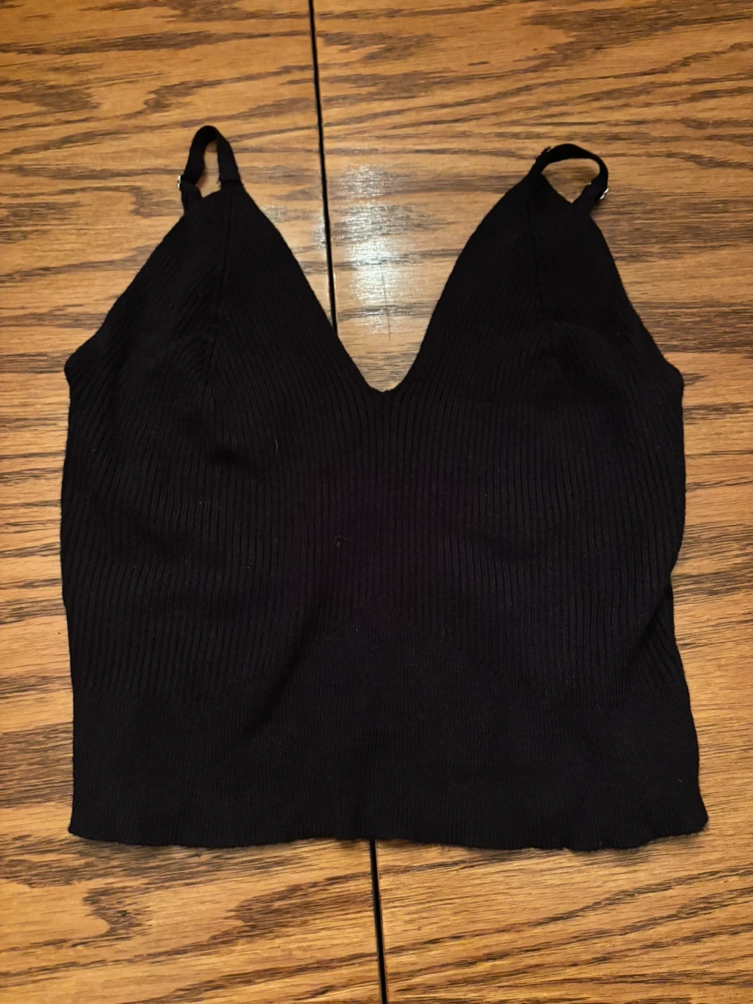 This is a black ribbed crop top from Forever 21. It's a size medium. It features adjustable spaghetti straps.