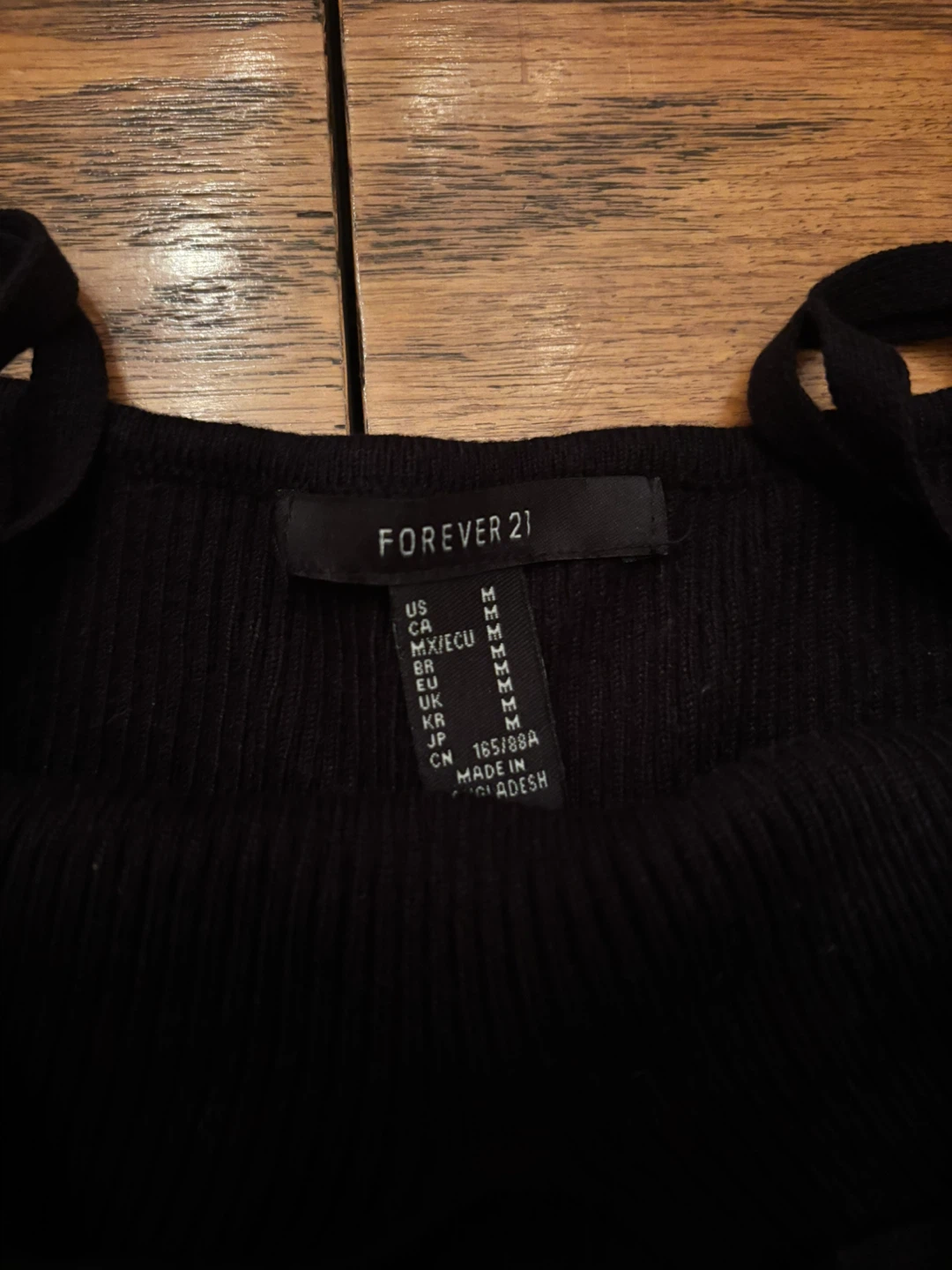 This is a black ribbed crop top from Forever 21. It's a size medium. It features adjustable spaghetti straps.