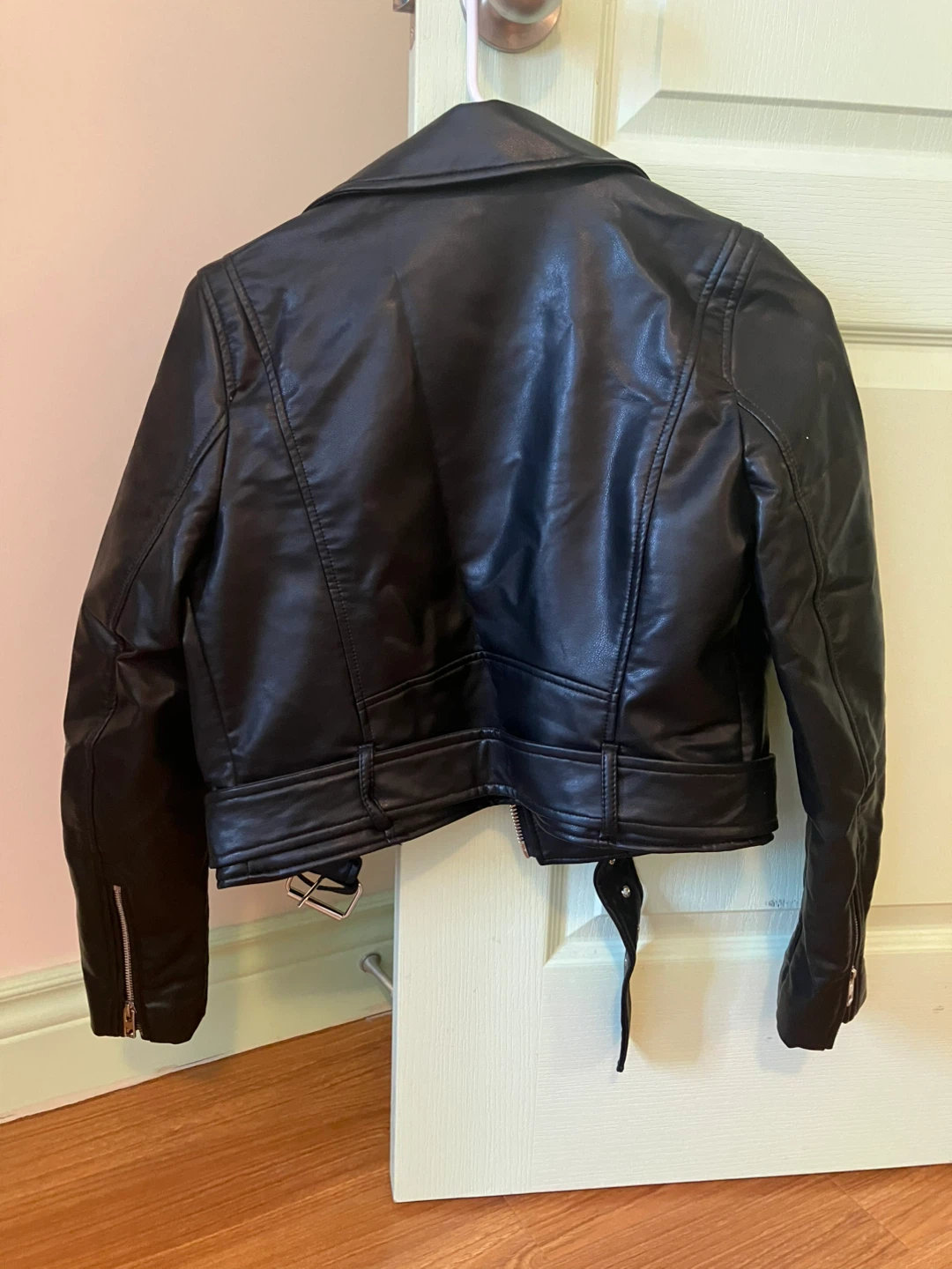 This ZARA moto jacket is black with a faux leather finish. It features a classic biker design with zippered pockets and a belt at the waist. It's a stylish outerwear piece that's great for layering.