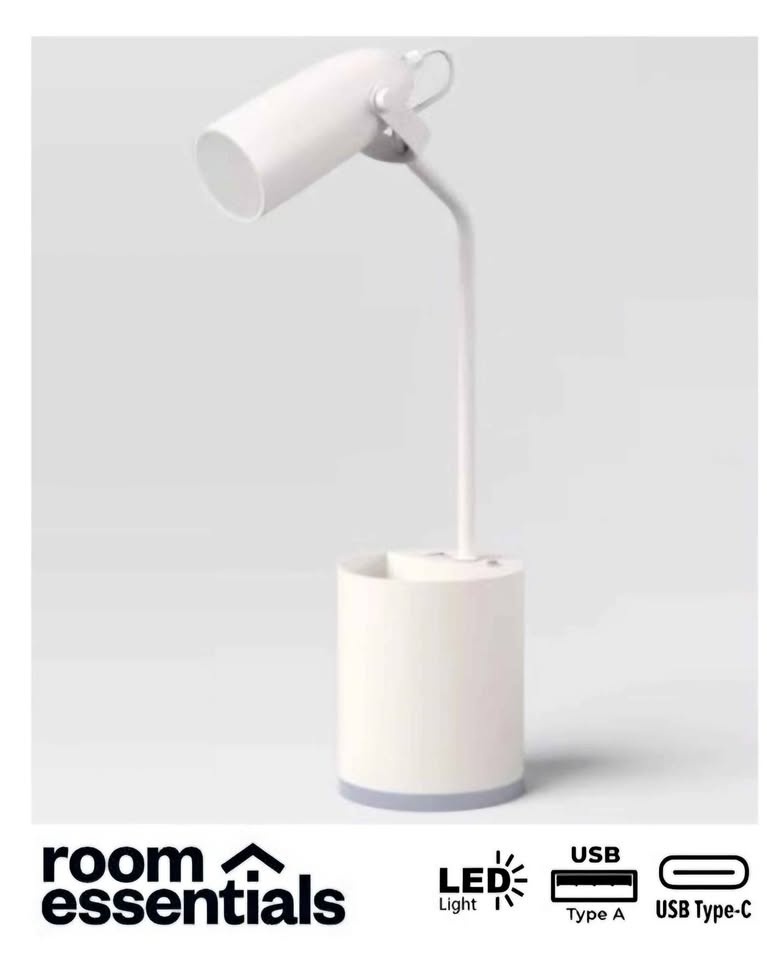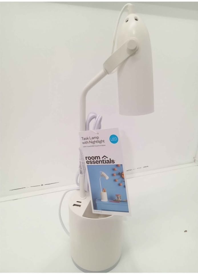 Bright Room Essentials task lamp with a built-in nightlight. It has USB-A and USB-C ports in the base for charging devices. The LED light is 4.5-watt bright white. It also has a small organizer spot in the base for pens or other small items. Energy efficient and great for a desk or bedside.