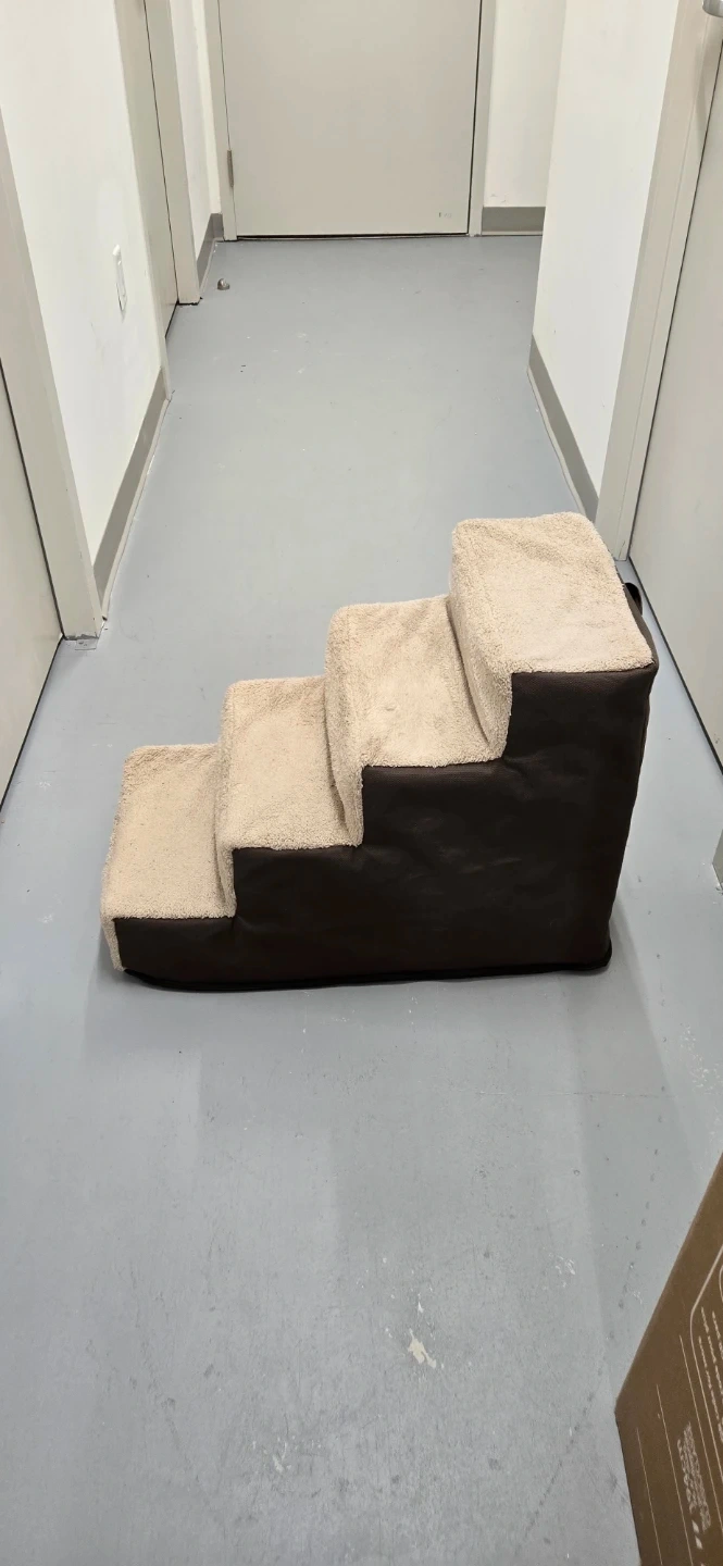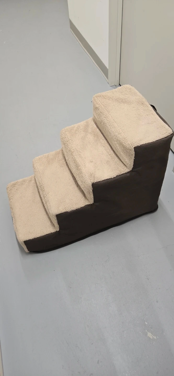 Lightweight, portable 4-step pet stairs for dogs and cats. The steps have a soft, comfortable, and washable cover. These stairs help pets reach high places or overcome obstacles. They're great for puppies, senior dogs, or pets with mobility issues!