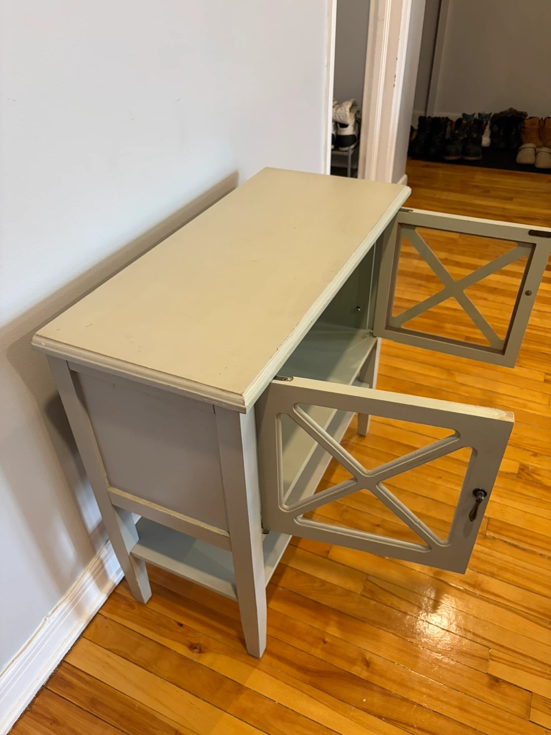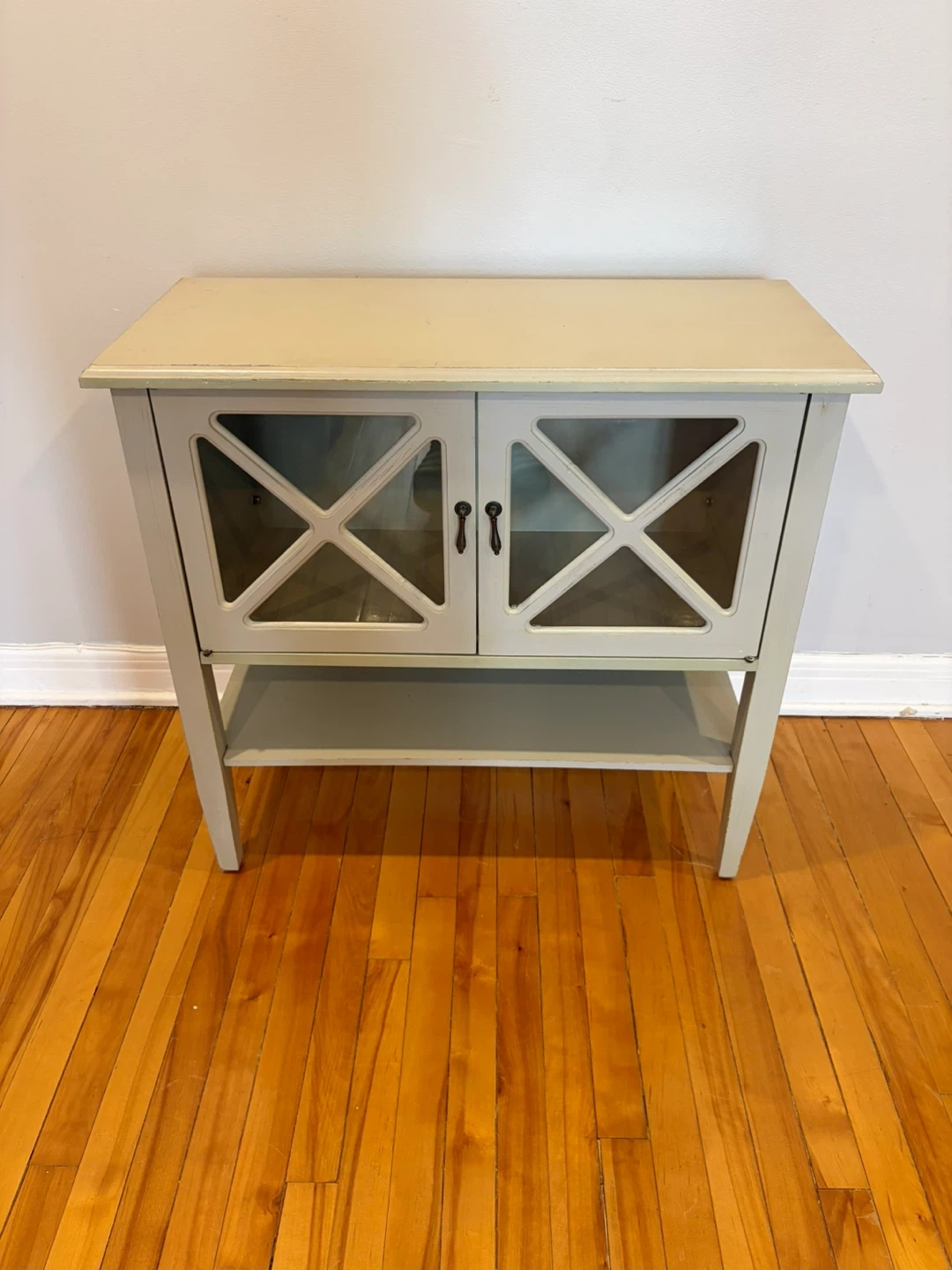 A light grey cabinet with two glass doors featuring an X-design. It has an open shelf below the main compartment. Perfect for storing smaller items or displaying decor.