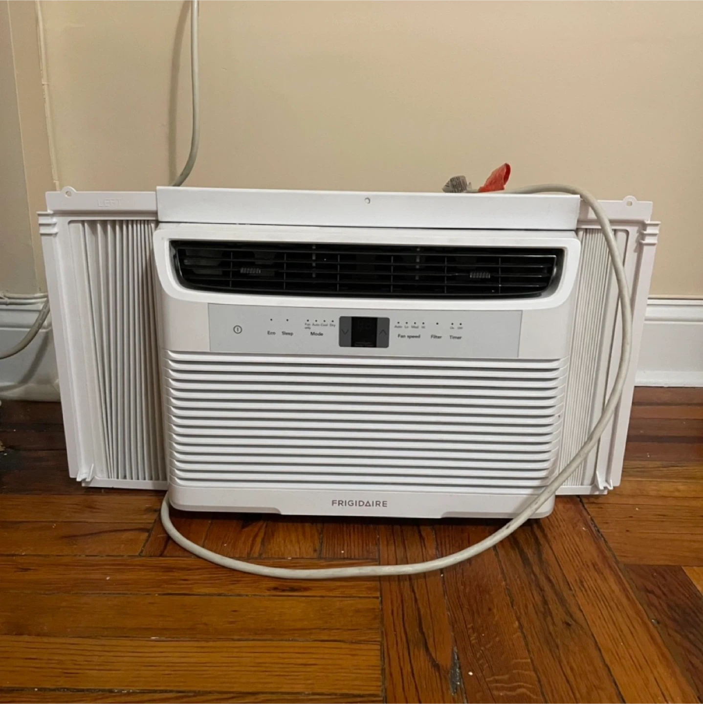 White Frigidaire window air conditioner. It features multiple fan speeds, modes like Eco and Sleep, and a timer. Includes expandable side panels for installation.