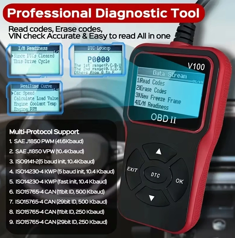 OBD2 Car Scanner V100 / Engine Fault Code Reader & Diagnostic Tool / Compatible All Vehicles Since 1996, Up to 36V, Without Battery