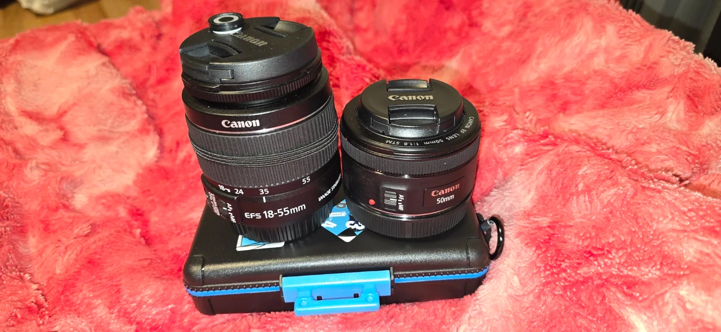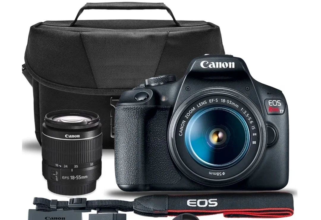 Canon EOS Rebel T7 DSLR camera bundle with an 18-55mm and 50mm STM lens. It includes two batteries, a charger, a camera strap, memory card/batteries carrying case and a carrying bag. This set is great for capturing everyday moments or starting your photography journey!