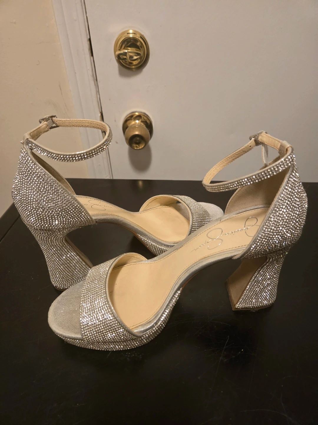Size 10 women's - sparkly silver heels by Jessica Simpson. These statement heels are covered in rhinestones and have an adjustable ankle strap. In great shape - worn only once!