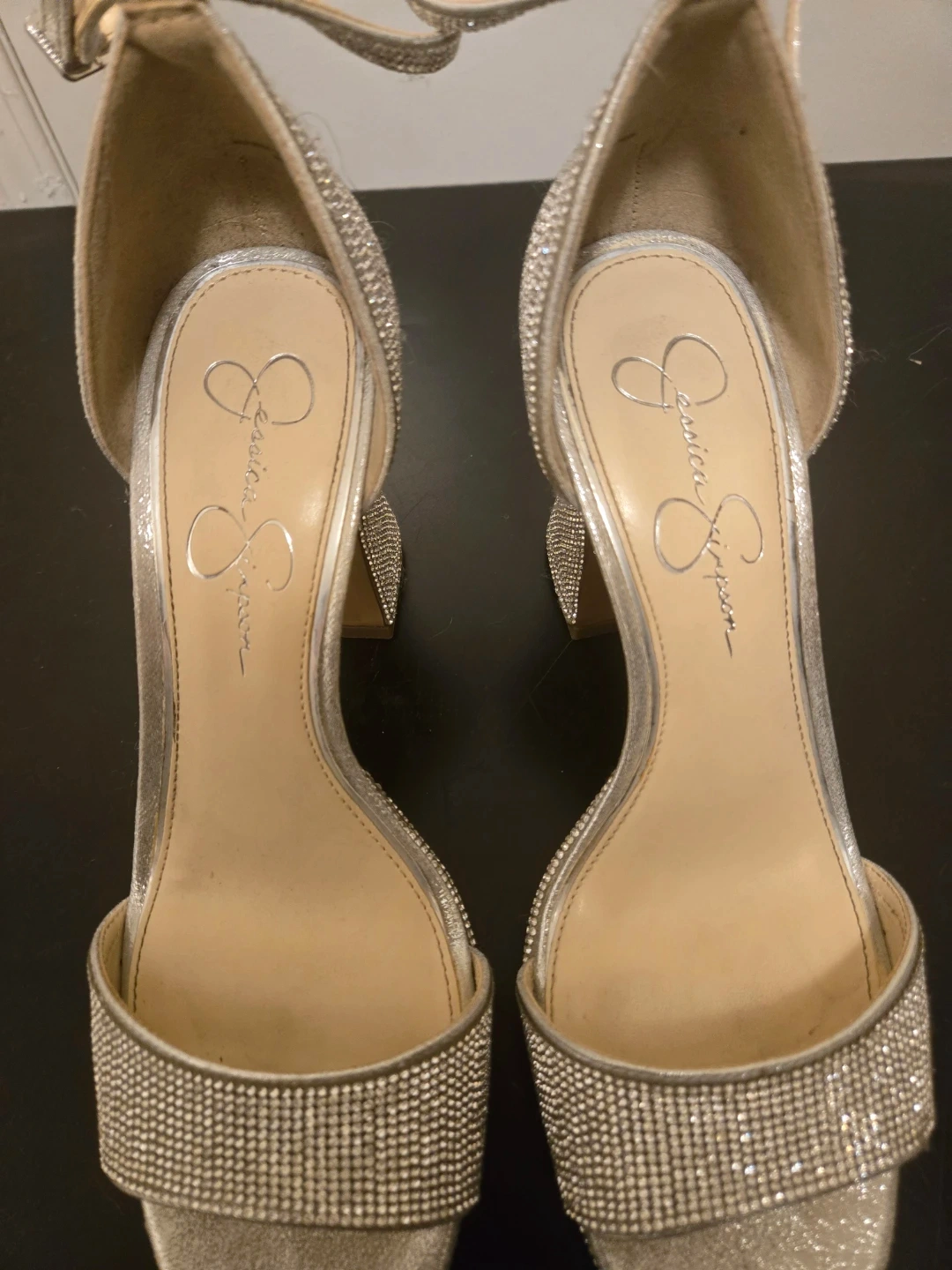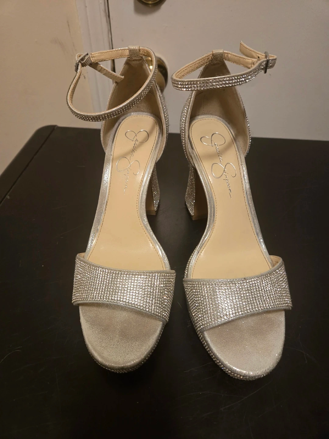 Size 10 women's - sparkly silver heels by Jessica Simpson. These statement heels are covered in rhinestones and have an adjustable ankle strap. In great shape - worn only once!