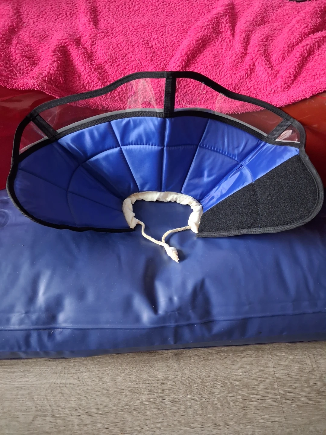 This is a pet recovery collar, also known as an Elizabethan collar or e-collar. It's designed to prevent pets from aggravating a surgical site or wound. The collar is blue with a clear plastic shield. It has a drawstring closure for adjustable fit.