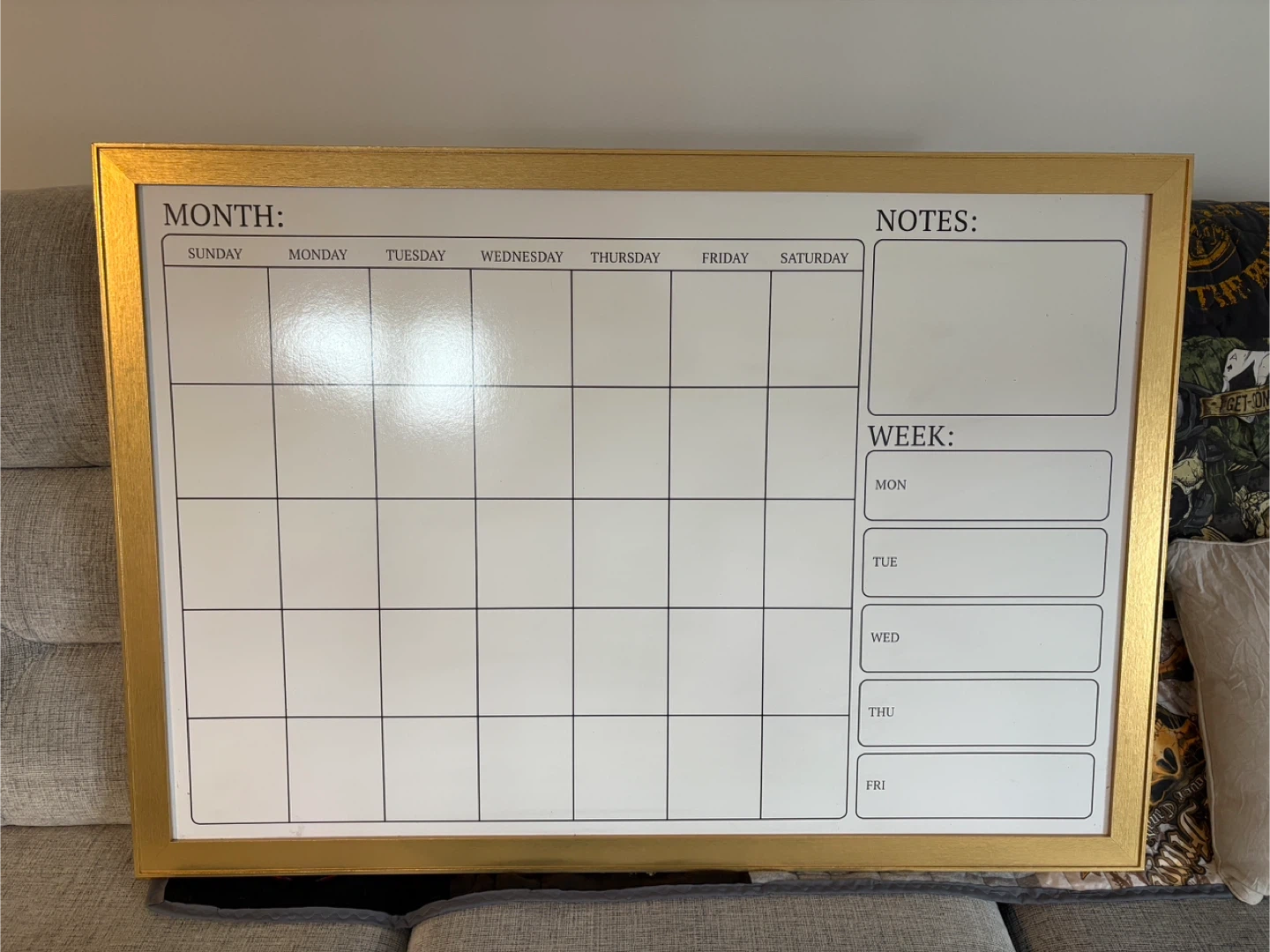 A dry erase whiteboard calendar with a gold frame. Includes a section for notes and weekly reminders. Comes with a bag of colorful dry erase markers.