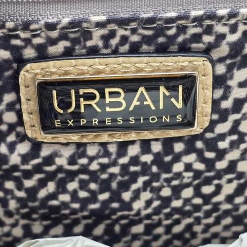 The Urban Expression Envelope Clutch Bag is a stylish and trendy handbag designed for women. Made from faux leather with a chic animal print pattern, this clutch features a beautiful gold and beige color combination that adds a touch of sophistication to any outfit. The beige handle/strap and hardware details complement the overall design, while the polyester lining ensures durability. Perfect for carrying essentials in style, this clutch is a must-have accessory for any fashion-forward woman.