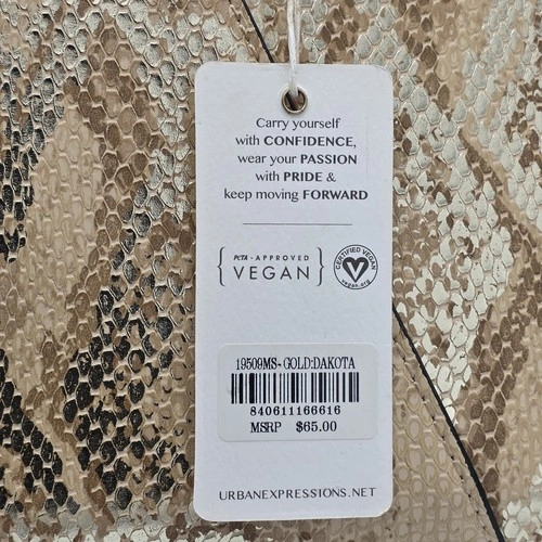 The Urban Expression Envelope Clutch Bag is a stylish and trendy handbag designed for women. Made from faux leather with a chic animal print pattern, this clutch features a beautiful gold and beige color combination that adds a touch of sophistication to any outfit. The beige handle/strap and hardware details complement the overall design, while the polyester lining ensures durability. Perfect for carrying essentials in style, this clutch is a must-have accessory for any fashion-forward woman.