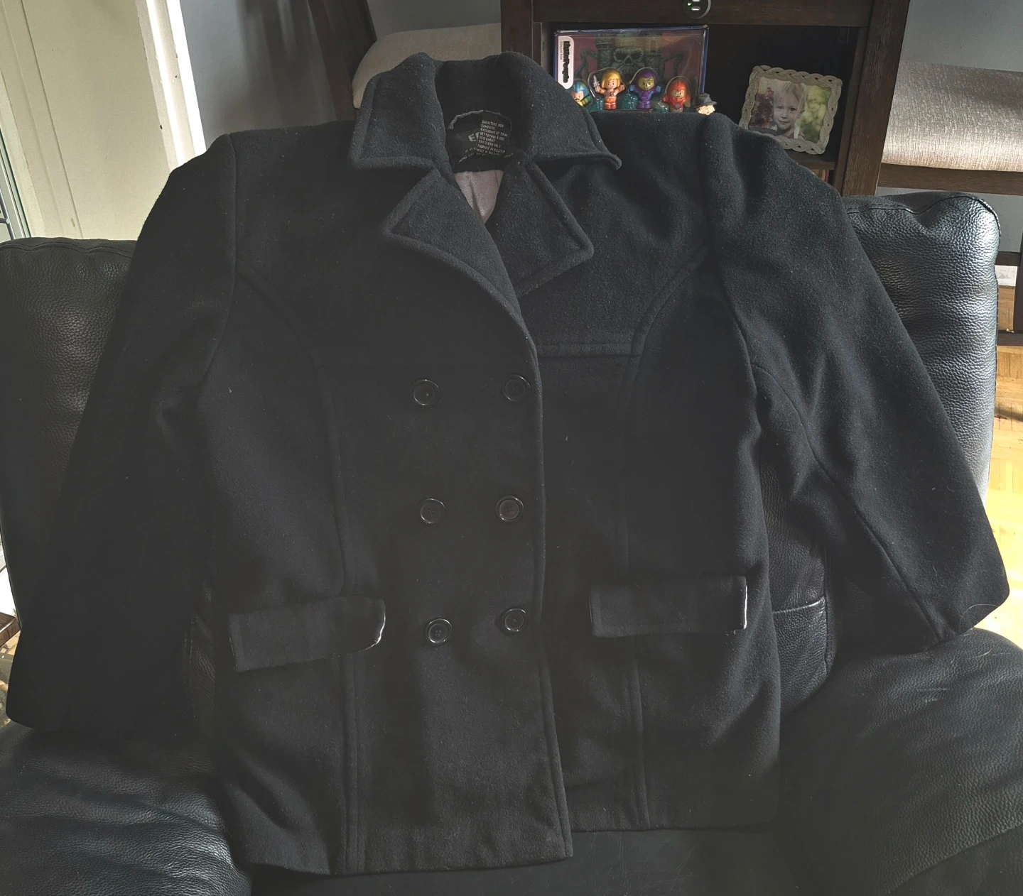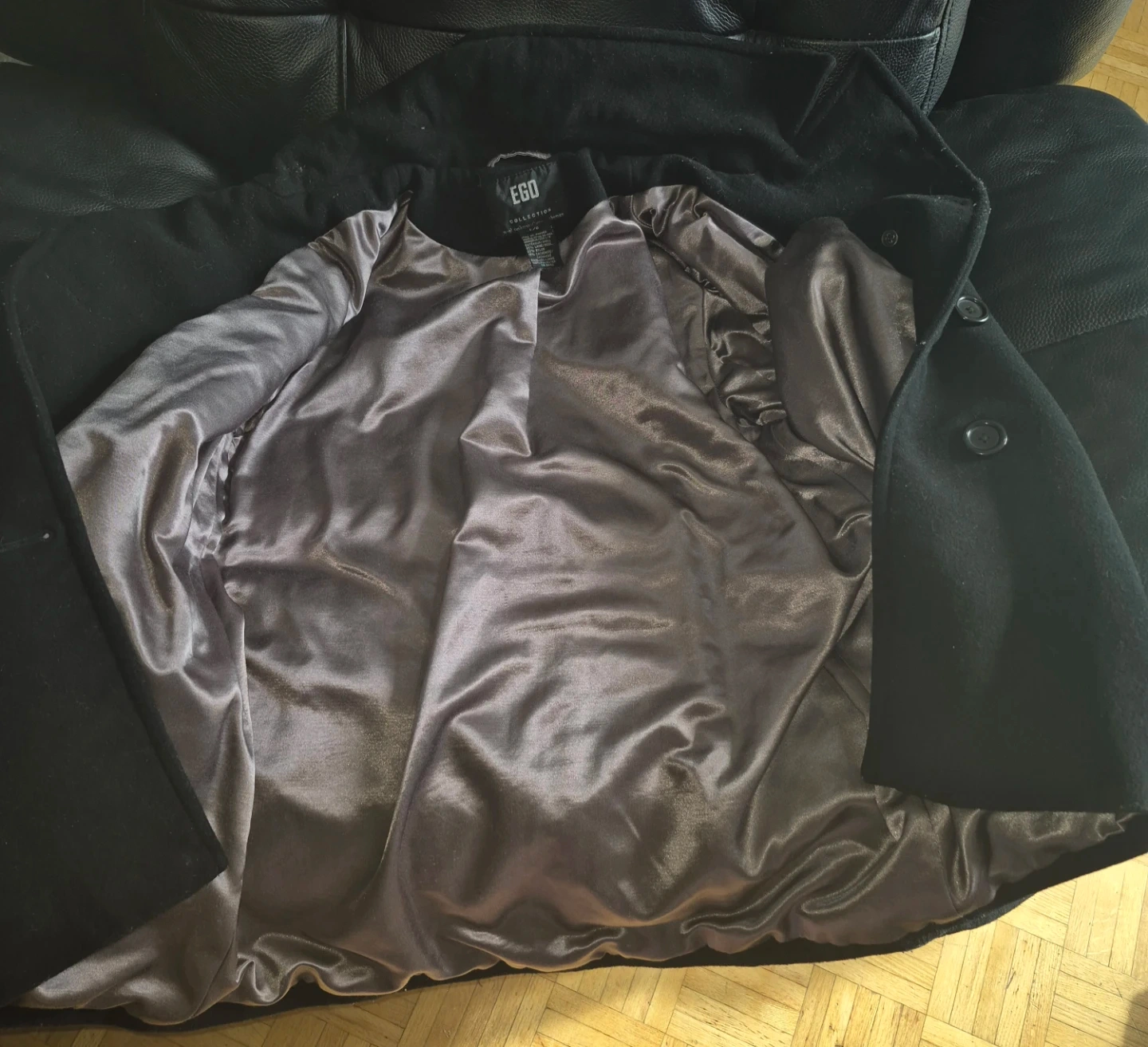 Selling a lovely black wool and cashmere coat from Ego Collection. It's a size L/G and features a stylish design. The shell is made of 65% wool and 20% cashmere, making it warm and comfortable for the colder months. The lining is 100% polyester.