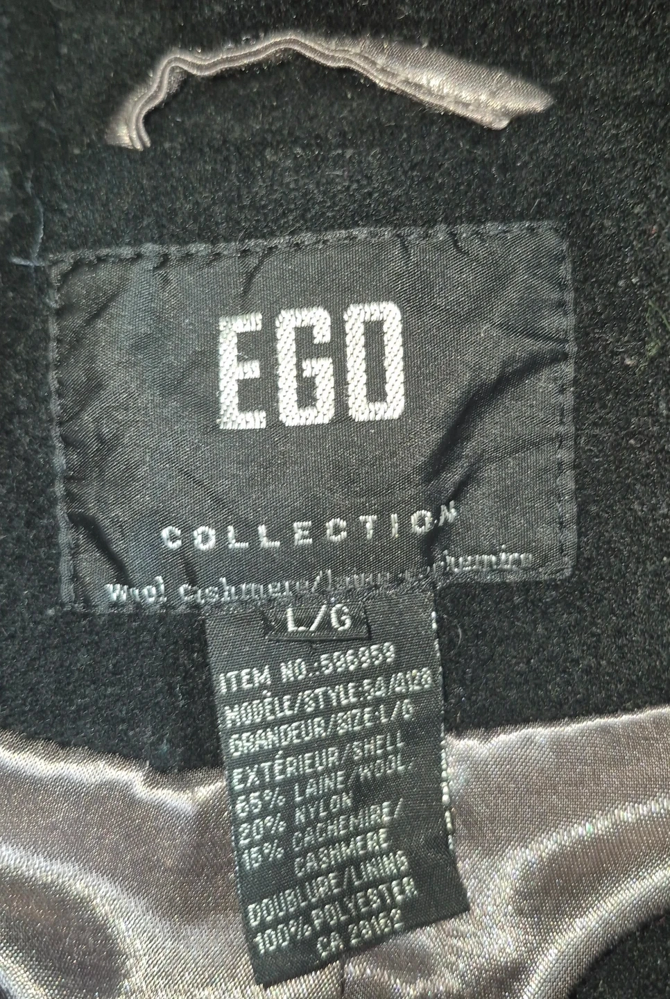 Selling a lovely black wool and cashmere coat from Ego Collection. It's a size L/G and features a stylish design. The shell is made of 65% wool and 20% cashmere, making it warm and comfortable for the colder months. The lining is 100% polyester.