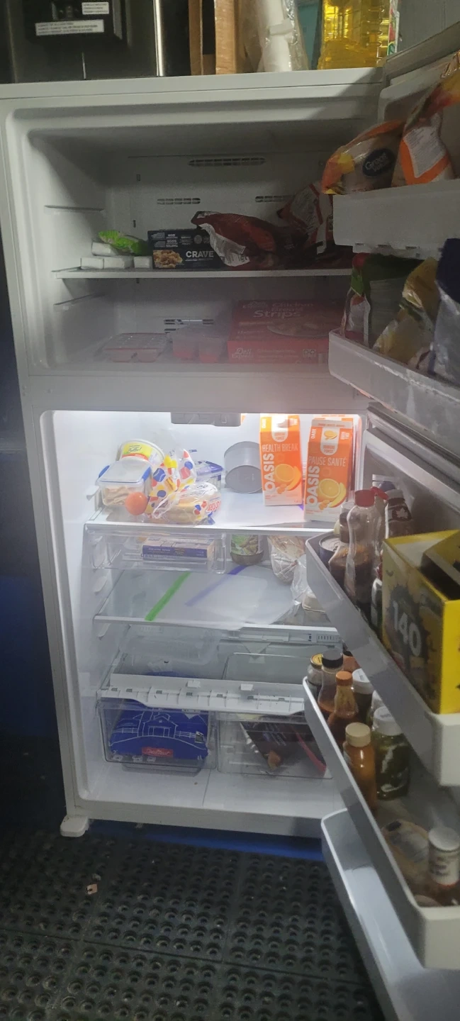 This is a Frigidaire top freezer refrigerator. It's a white model with a standard configuration. The interior features adjustable shelves and door bins Like new.
