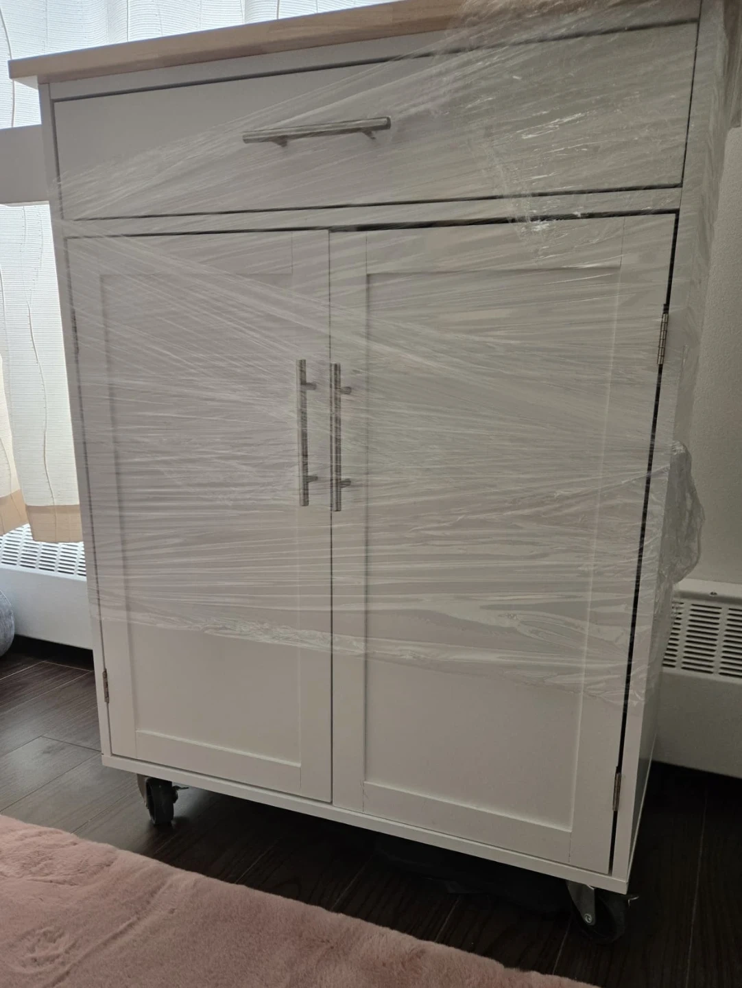 Selling a kitchen island with a lovely wood top and a white base. It's still wrapped in plastic, so it's in brand new condition! It features a drawer and cabinet space for storage, and it's on wheels for easy moving, dimensions are 40W, 70L and H is 90.