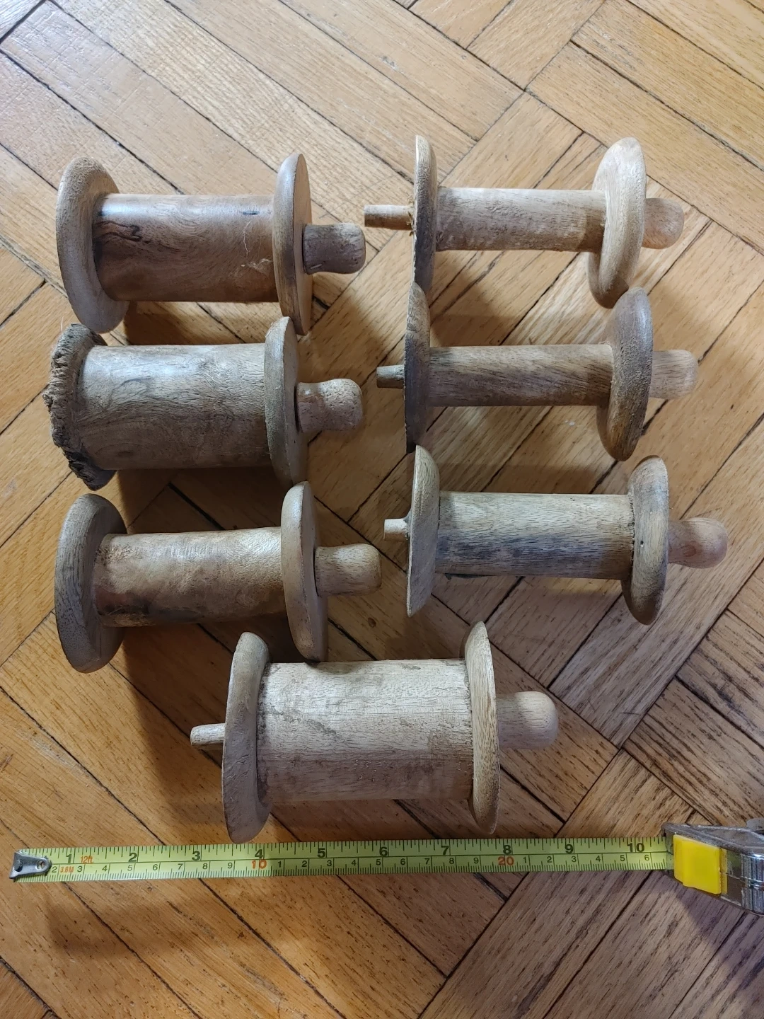 Set of 7 rustic wooden ribbon spools. They're made of solid wood and have a natural finish. Each spool measures approximately 5 inches long.