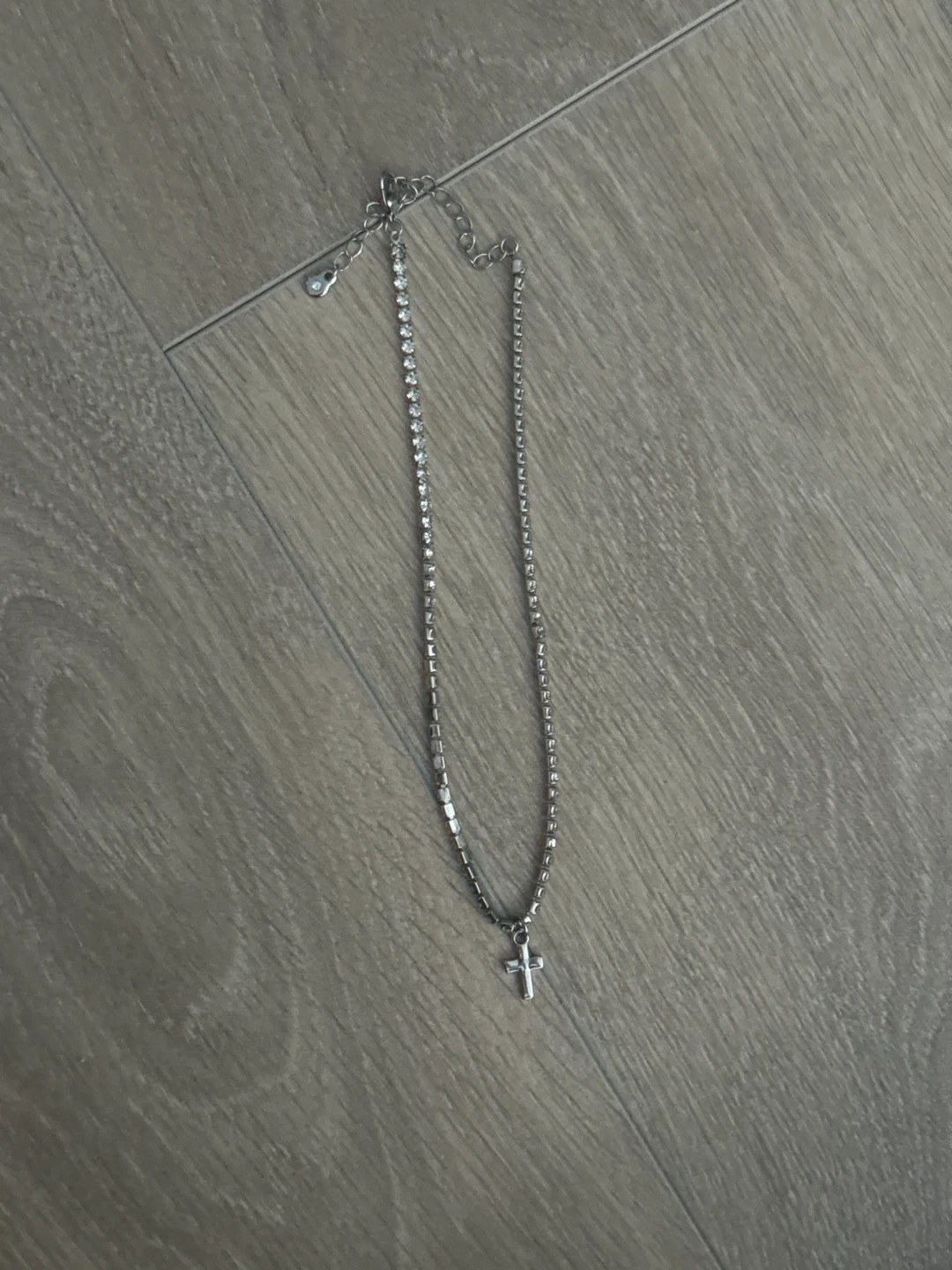 A simple silver-tone chain necklace with a small cross pendant. It's adorned with small rhinestones along the chain. This necklace features an adjustable clasp for a custom fit. Its never worn selling since im a student. I do discounts on bundles!!