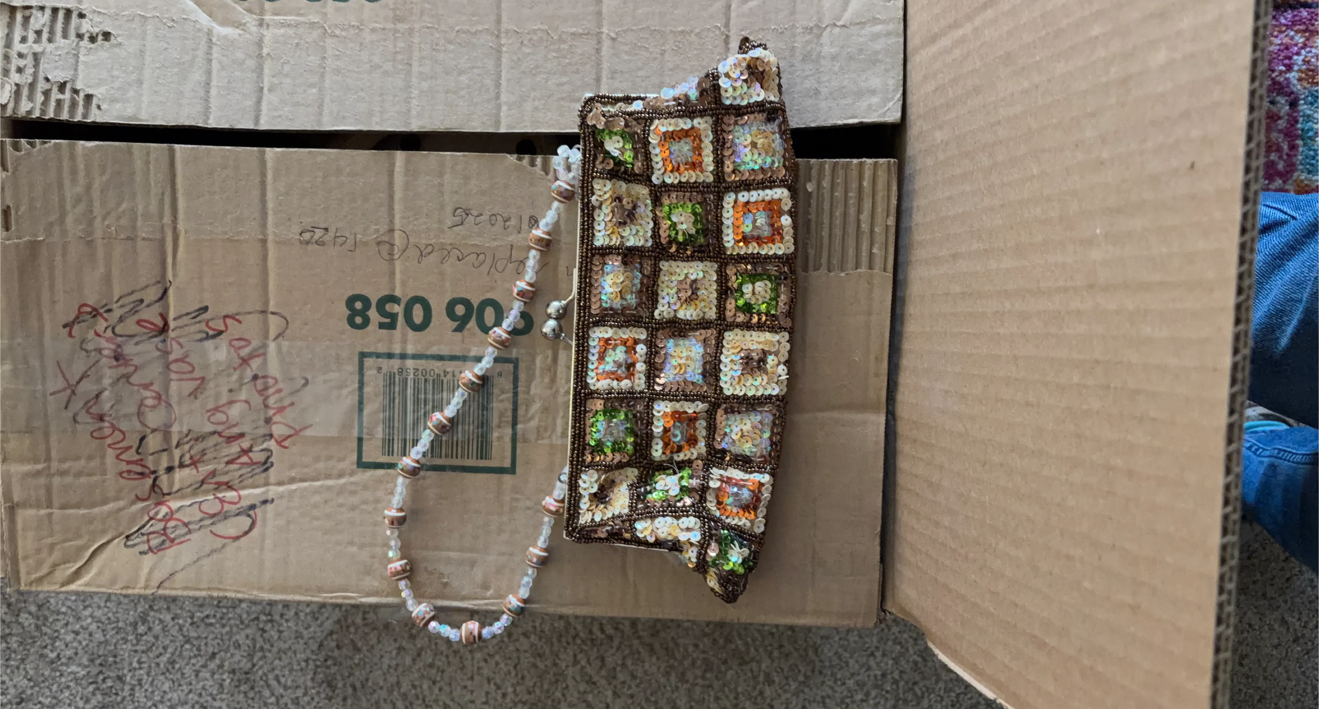 This clutch bag features a beaded mosaic design with colorful squares. It has a delicate beaded chain strap. Interior is lined with brown fabric. It's a unique piece!