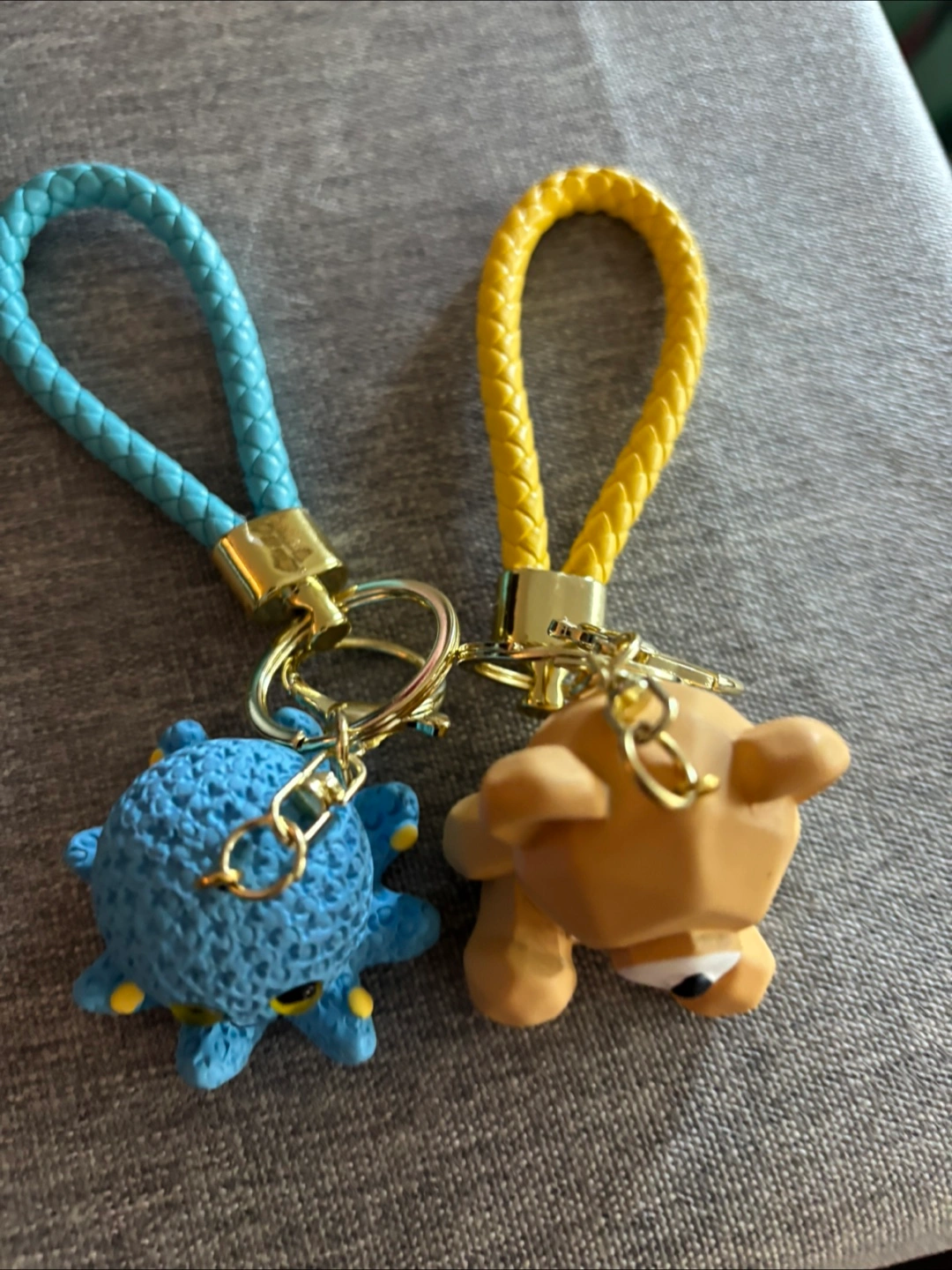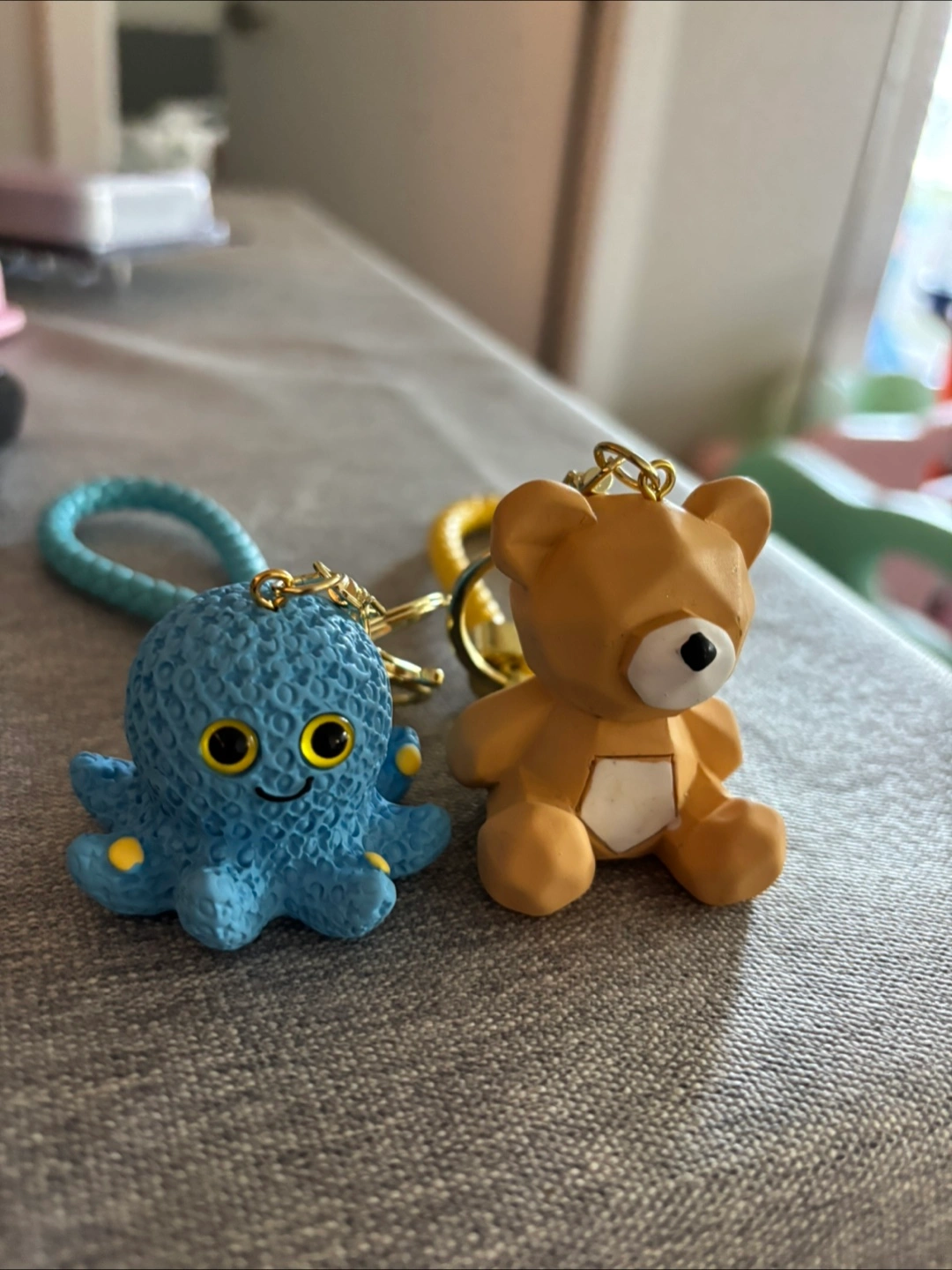 Selling these adorable keychains! One is a blue octopus and the other is a tan bear. Perfect for adding a bit of fun to your keys or backpack