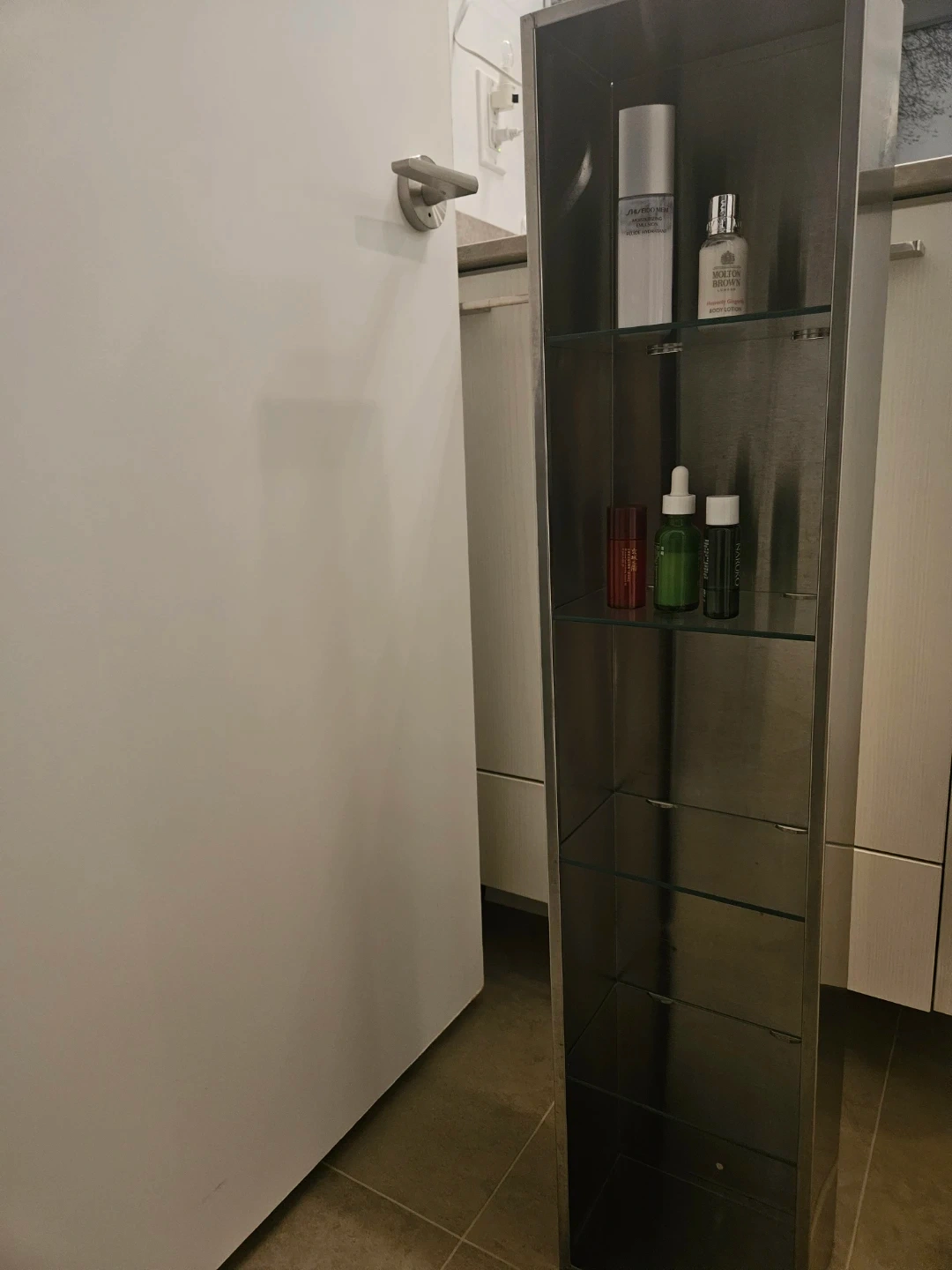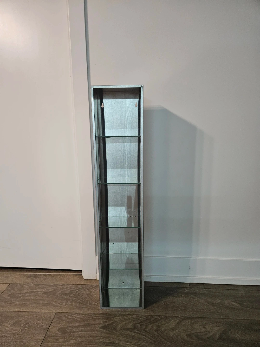 Selling a tall shelf with a silver metal frame and glass shelves. It's in great shape and ready to organize your space! Perfect for displaying items or adding storage in a small area
